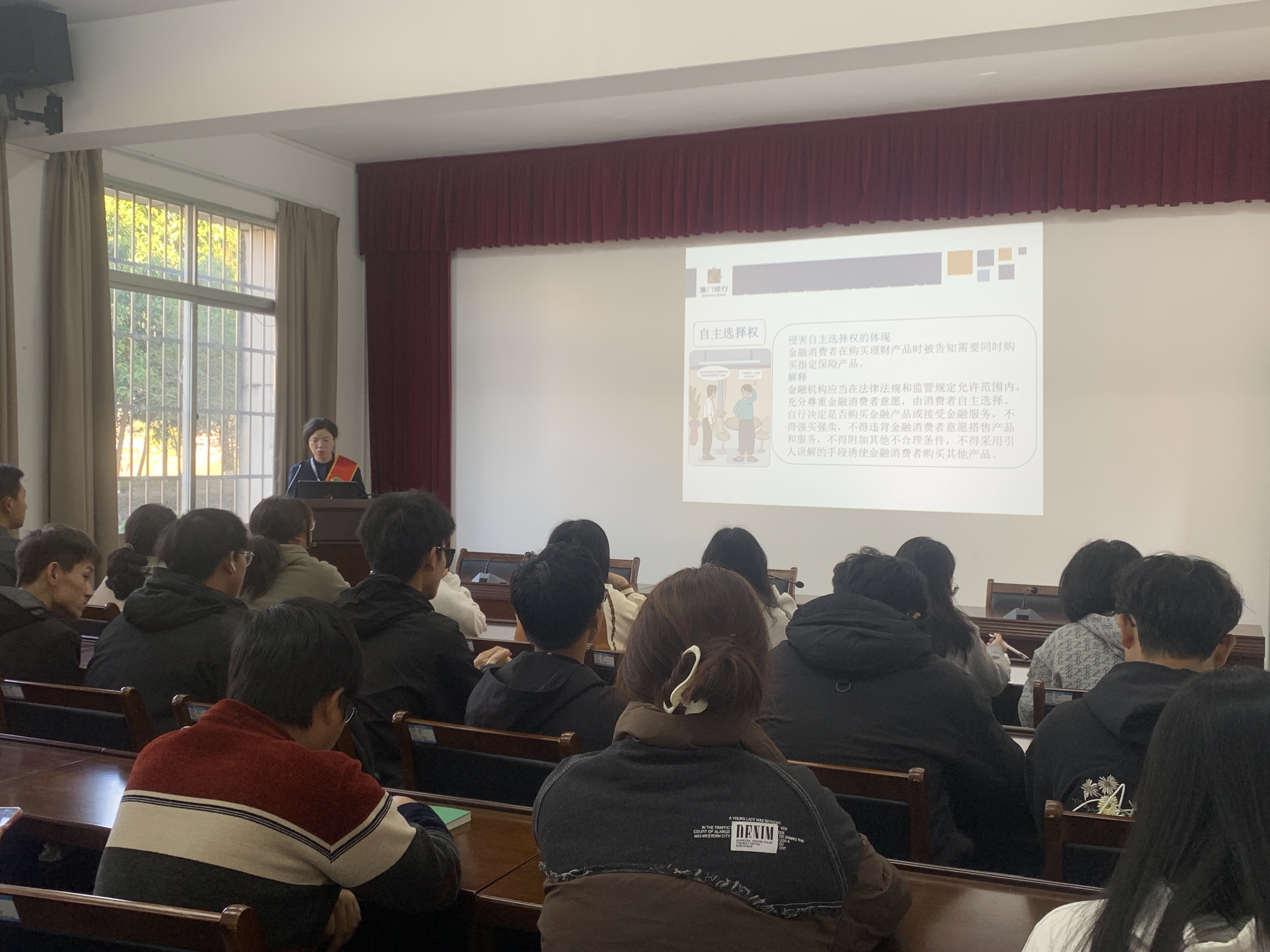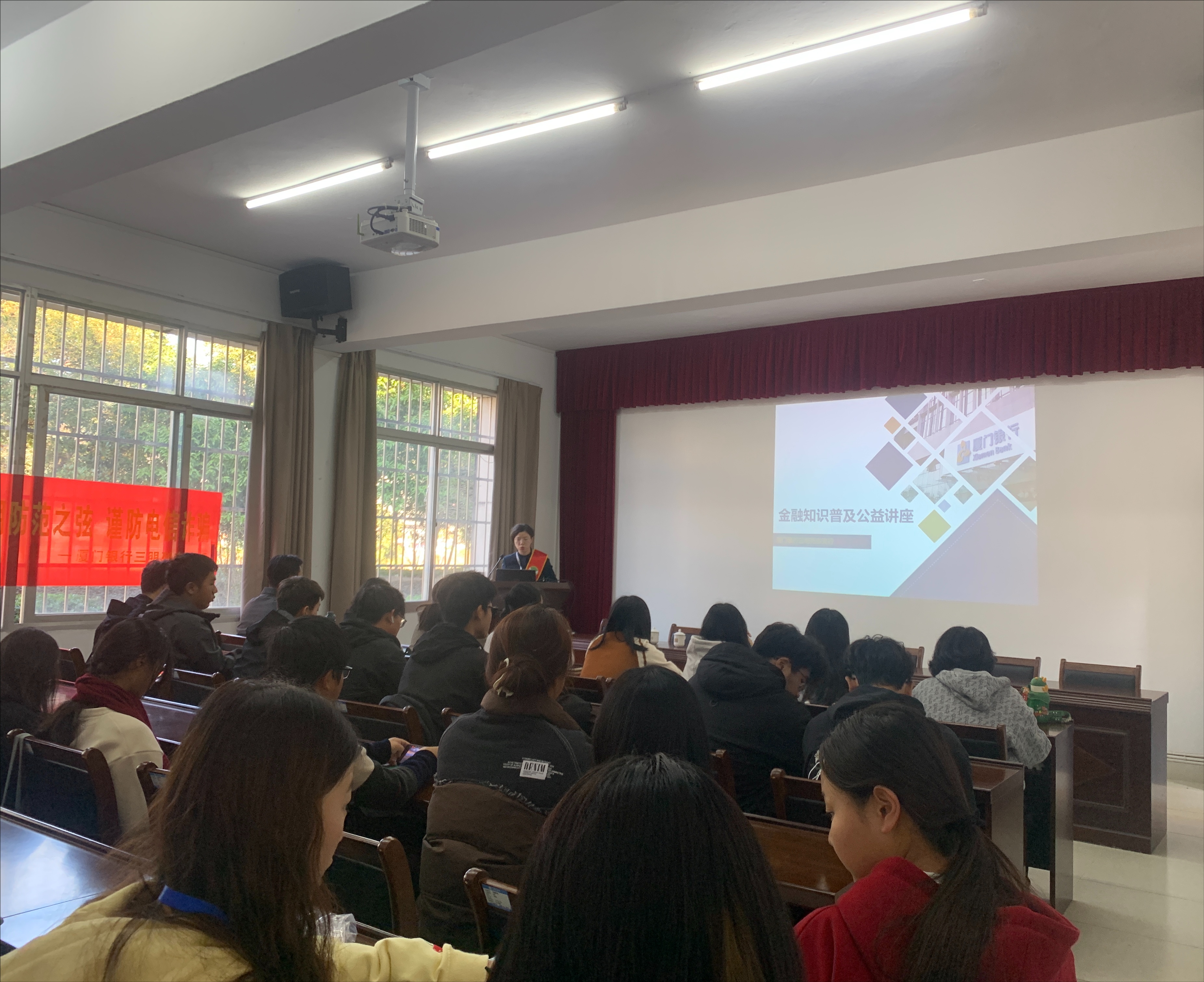 讲座伊始,厦门银行的资深金融专家以通俗易懂的方式向同学们介绍了基础金融知识,包括货币的起源与发展、银行储蓄与利率计算等。通过深入浅出地讲解,同学们对金融有了更直观的认识。随后,针对校园中可能存在的金融风险,如网络诈骗、不良校园贷等,专家结合实际案例进行了详细剖析,传授了实用的风险识别与防范技巧,如如何识别正规金融机构、如何保护个人信息安全等。