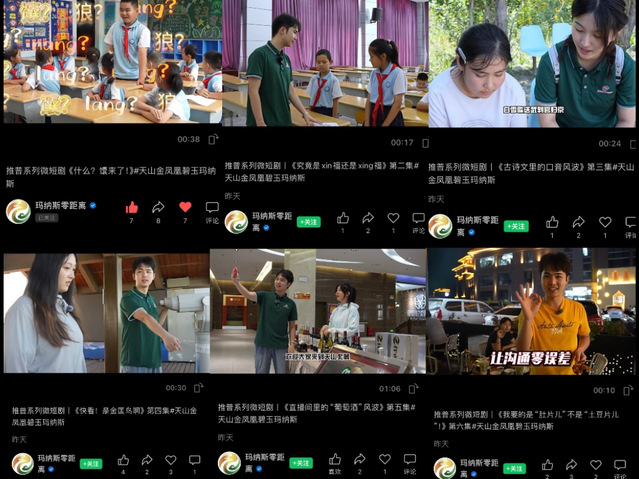 从玛纳斯县社区课堂到产业一线,实践队以一天一剧的节奏推进创作。在红领巾小课堂上,30名中小学生参与演绎短视频《什么?馕来了!》《究竟xin福还是xing福》,通过方言与普通话的对比,在欢笑中理解语言规范的重要性。在塔西河乡政府内,短视频《古诗文里的口音风波》结合当地村民发音前后鼻音不分的习惯,用普通话重新诠释经典诗词。在玛纳斯湿地公园里,短视频《快看!是金匡鸟啊》将生态保护用语与普通话教学结合,而县博物馆与葡萄酒企业取景的短视频《直播间里的葡萄酒风波》,则通过员工用普通话讲解酿造工艺,展现语言对产业升级的推动。所有微短剧自7月28日起, 在新疆玛纳斯县融媒体中心微信视频号、三明学院电视台抖音号两大平台同步上线,上线以来平台 播放、点赞量破万。