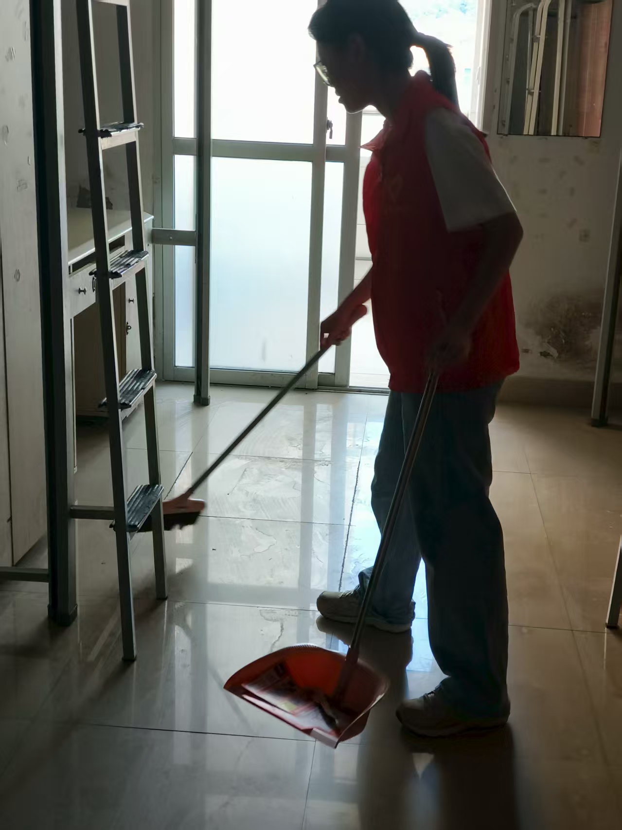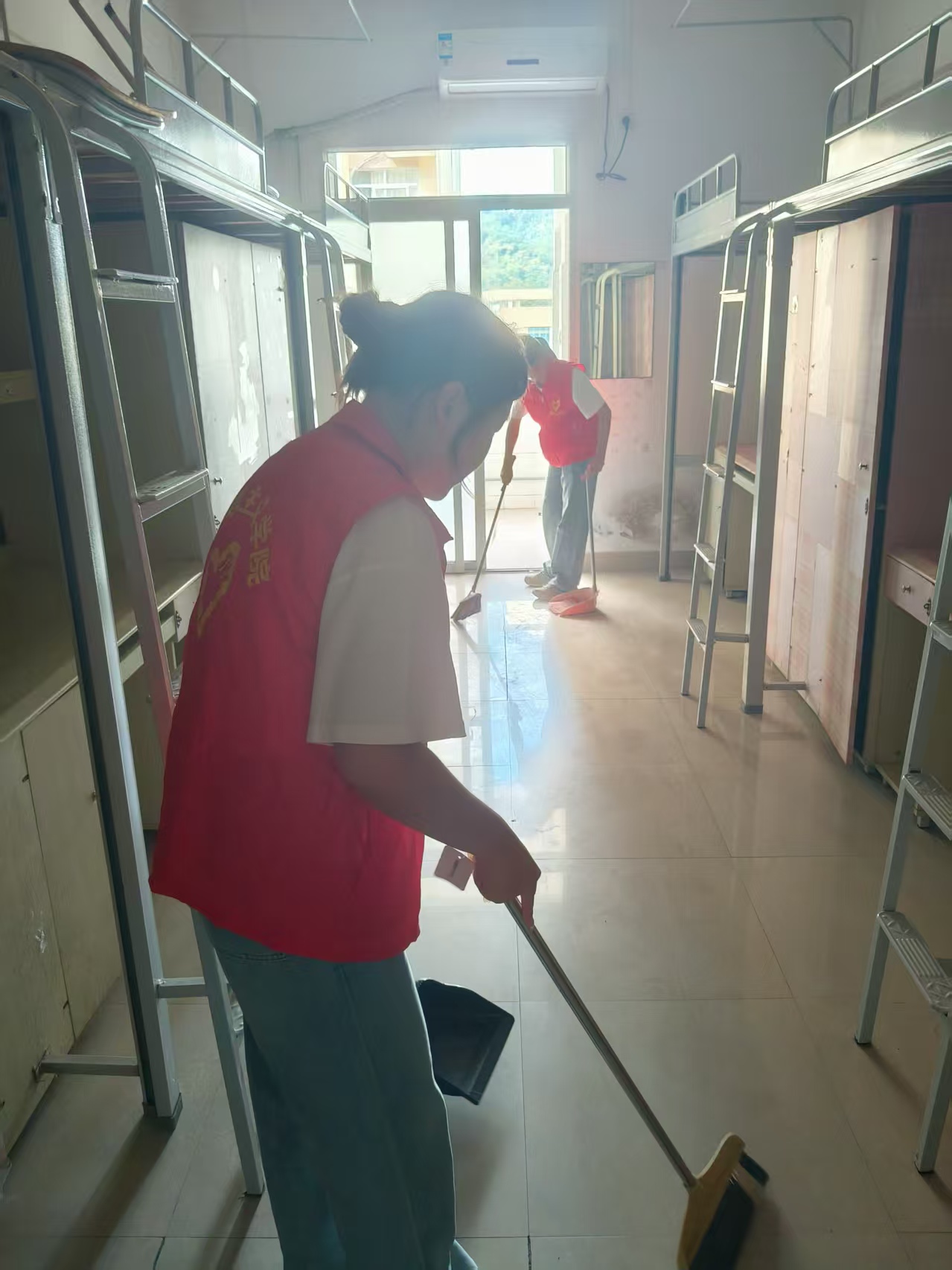 为营造安全整洁的宿舍环境,新生小导分组对全院新生宿舍逐间排查,重点关注电路安全、设施完好度及卫生状况,详细记录门窗、床铺、水电等待修问题,联动后勤部门高效处置,确保硬件安全达标。党员学生骨干携带工具,对宿舍地面、书桌、阳台、卫生间等区域精细清扫,擦拭除尘、清理杂物,打造整洁有序的“开学第一站”。