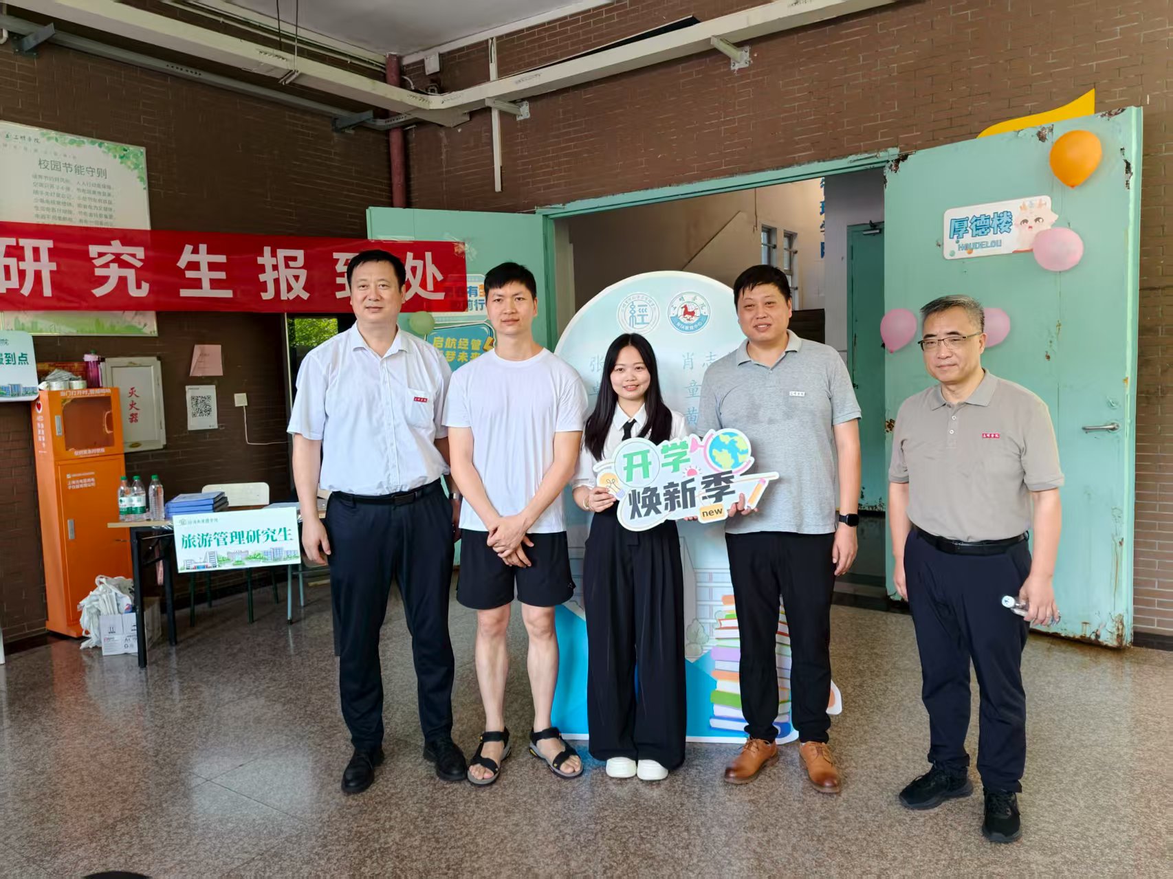迎新现场,志愿者们热情指引,“你好,麻烦问一下数字经济专业在哪里报到呀?”“你好呀,是今年的新生吧,跟我来,数字经济专业报道在这边”。学生代表则分工明确,组织维护现场秩序。与以往不同的是,今年经管院专设研究生迎新点,迎接首届研究生入学。抵达报到点后,新生就可以领取装有扇子、笔记本、学生证、校徽的新生大礼包。在精心布置的KT板与主题展板前,新生们兴致勃勃地拍照打卡,定格入学的美好瞬间。此外,整洁温馨的休息区成为家长们安心等候的“港湾”,当天,校领导张君诚校长、吴龙副校长深入厚德楼迎新点,细致了解报到进展,与新生及家长亲切交流,倾听他们的需求和感受。