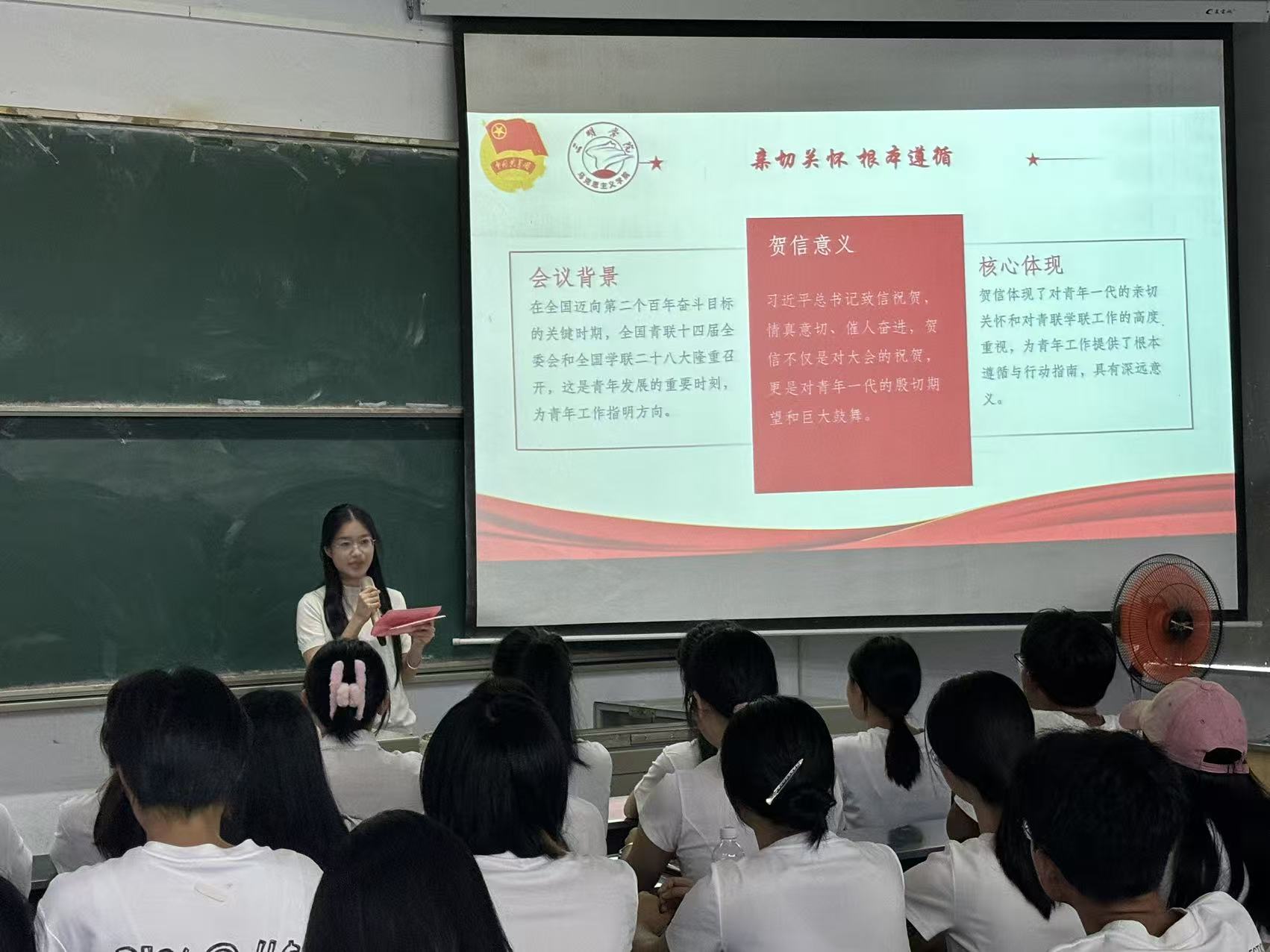会议伊始,团员代表尧瑞凝同学带领全体与会人员认真学习了习近平总书记致全国青联十四届全委会和全国学联二十八大的贺信。尧瑞凝同学从贺信的主要内容、精神要义以及习近平总书记对青年学生的殷切期望等方面作了系统解读,引导广大团员青年深刻领会习近平总书记对新时代青年的关怀与嘱托,激励广大团员坚定理想信念,勇担时代使命。