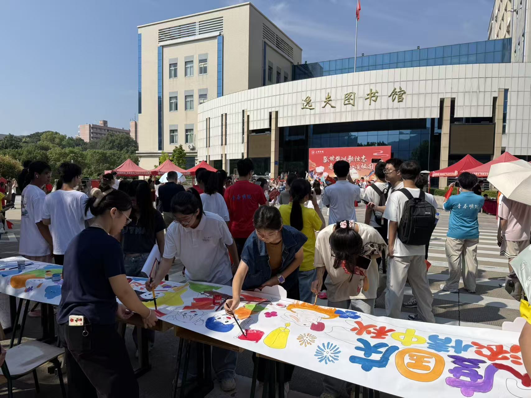 10月1日,三明学院逸夫图书馆前广场热闹喧腾,教育与音乐学院精心策划的“丹青绘双节,长卷展宏图”国庆中秋主题长卷绘画活动盛大开启,以艺术之笔共贺家国双节。
