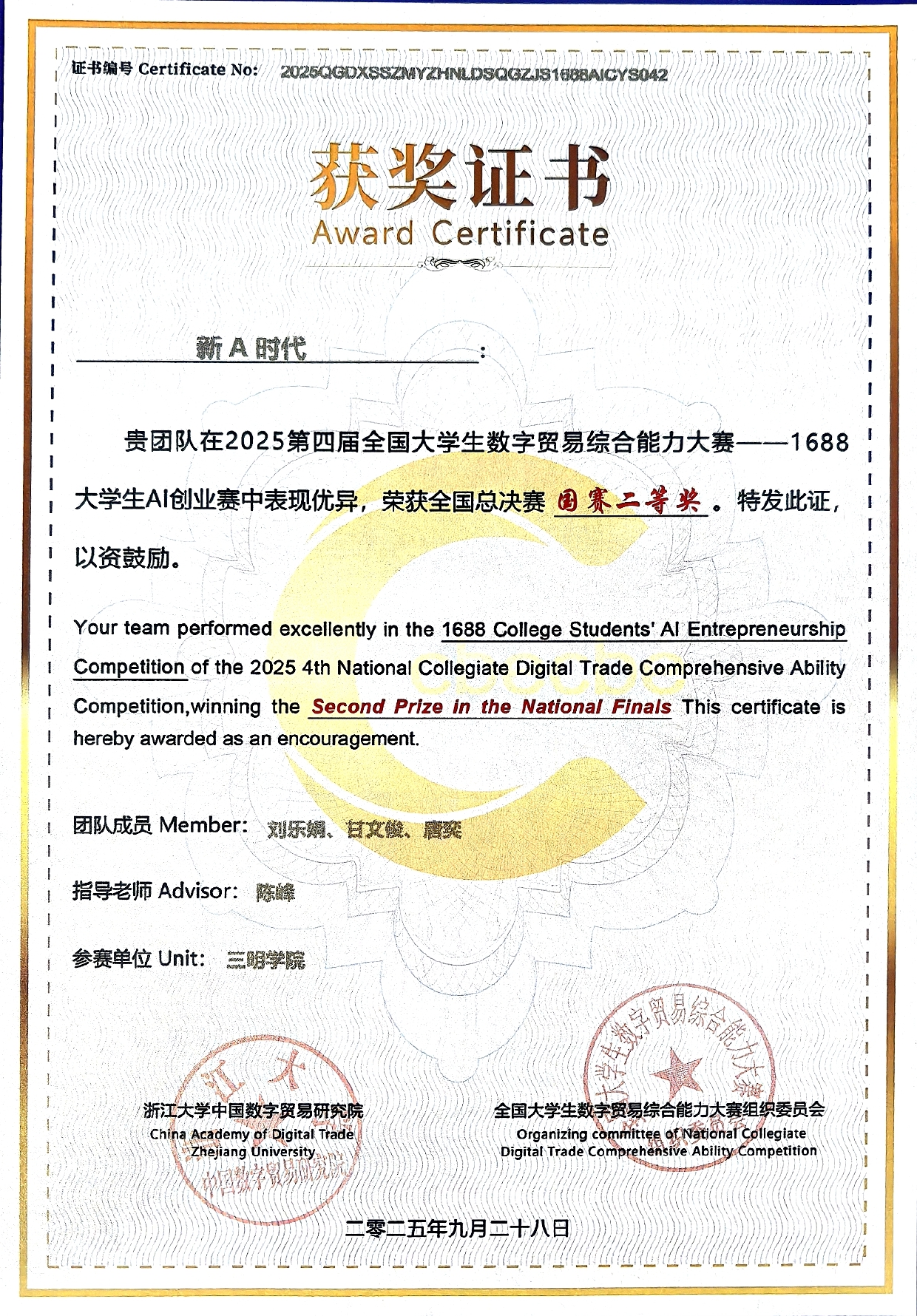 9月27日-28日,1688大学生AI创业赛全国总决赛在杭州顺利举办,三明学院经济与管理学院陈峰老师指导的两只队伍在决赛中分别斩获国家级二等奖与三等奖,彰显了学院学子扎实的创新实践能力。