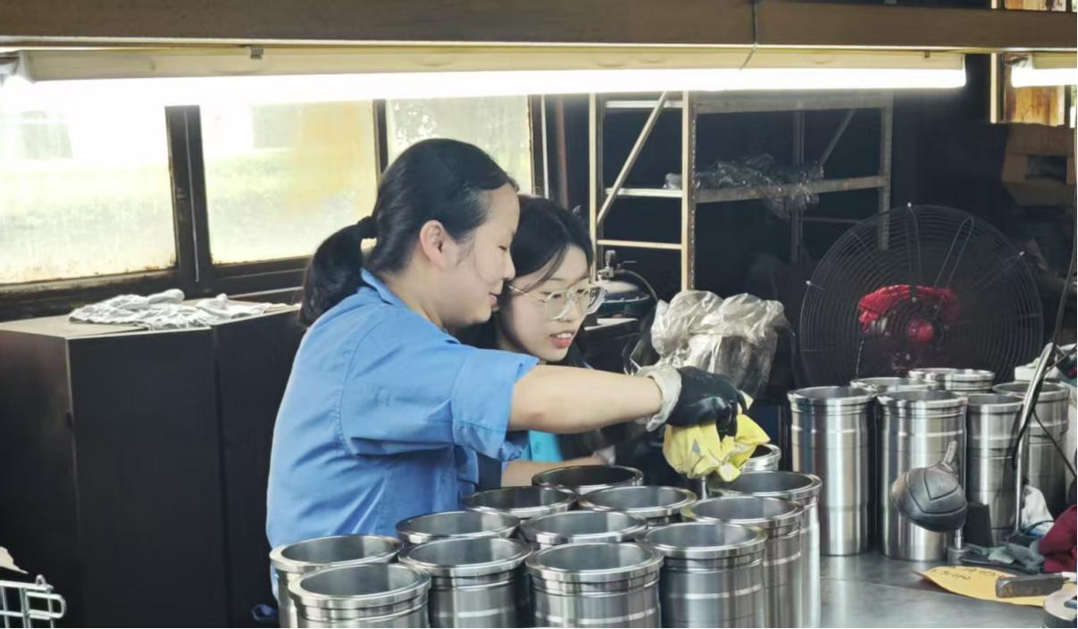 调研期间,实践团成员在技术人员的指导下,亲身参与气缸套生产流程,重点体验了擦气缸套工序。看似简单的擦拭动作,实则蕴含严格标准——既要确保缸套表面无丝毫油污残留,又需精准控制力度,避免刮伤精密加工的内壁。