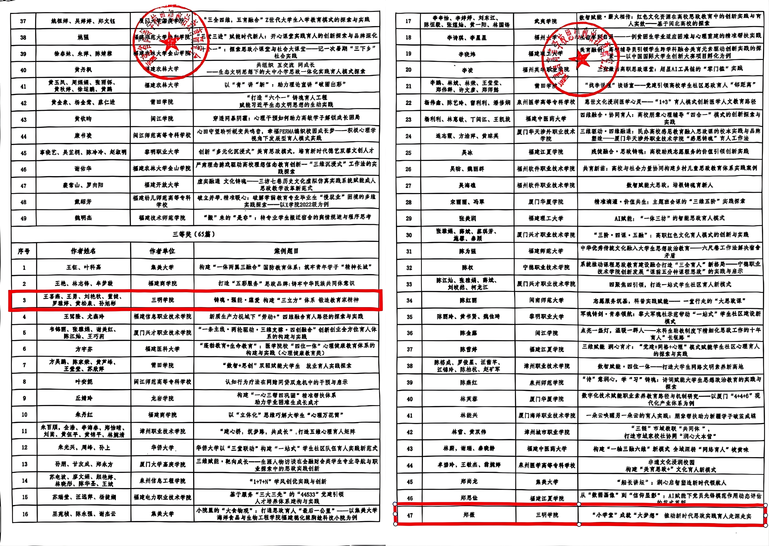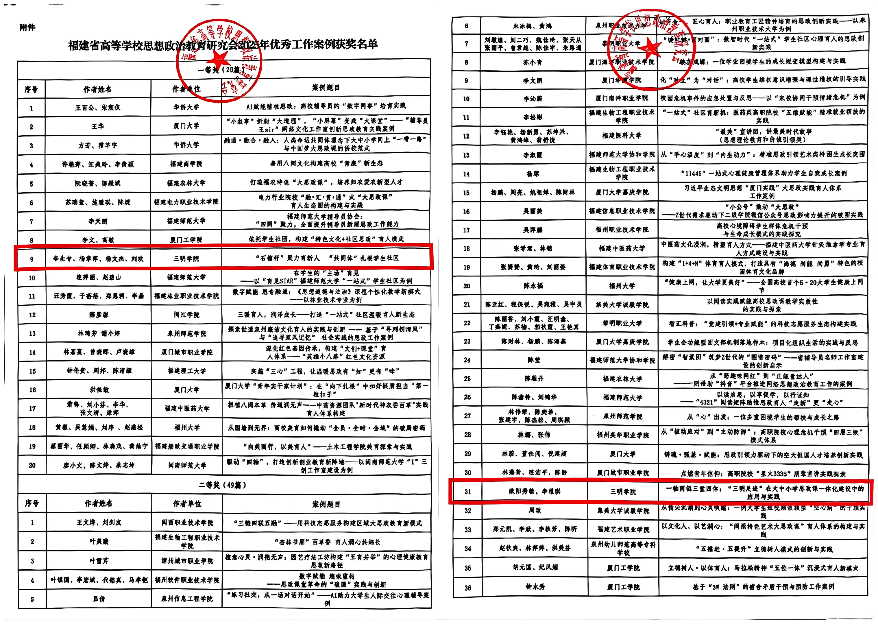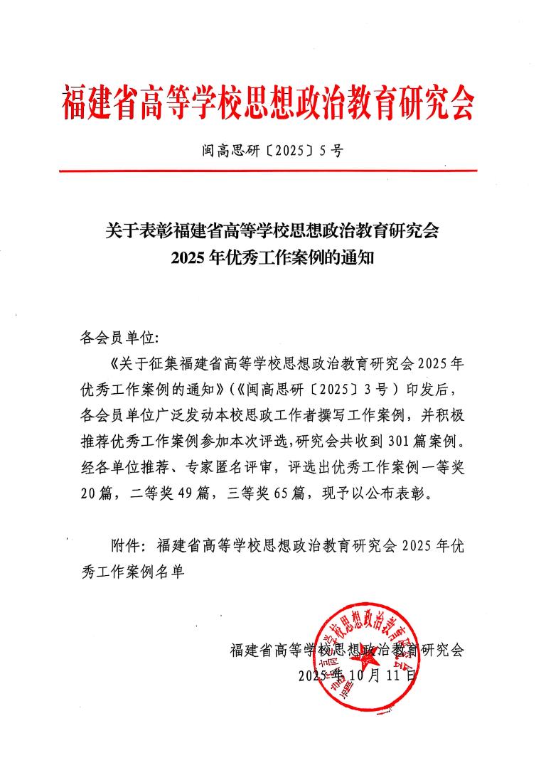 10月11日,福建省高等学校思想政治教育研究会公布《关于表彰福建省高等学校思想政治教育研究会2025年优秀工作案例的通知》。我校思想政治教育成果再获佳绩,《“石榴籽”聚力育新人 “共同体”扎根学生社区》荣获一等奖,《一轴两链三堂四体:“三明足迹”在大中小学思政课一体化建设中的应用与实践》荣获二等奖,《铸魂·强能·蕴爱 构建“三立方”体系 锻造教育家精神》《“小学堂”成就“大梦想” 推动新时代思政实践育人走深走实》分别荣获三等奖。