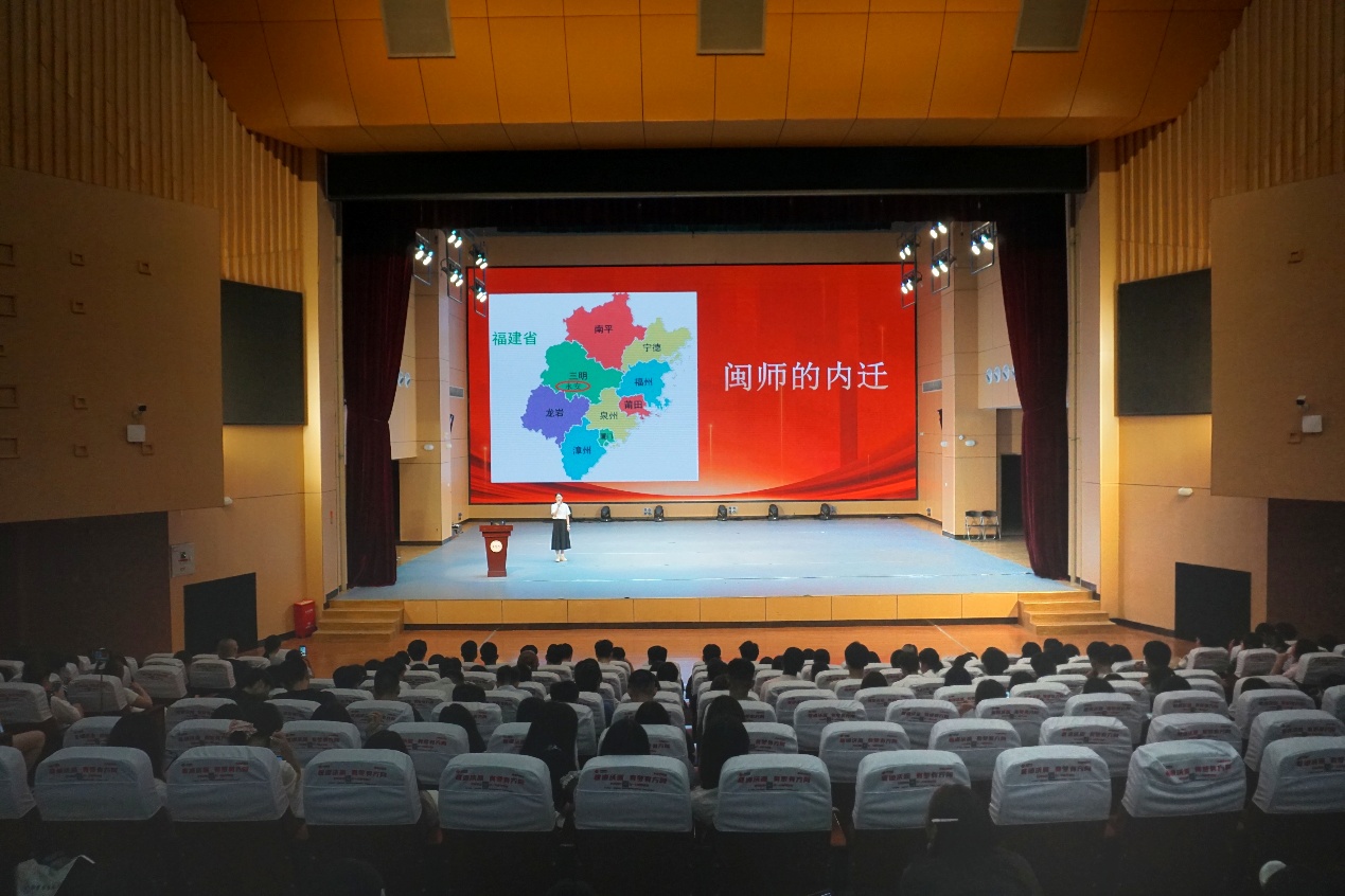 适应指导环节聚焦宿舍关系、专业学习与课余规划等方面,结合典型案例,就作息差异、卫生分歧等常见问题,引导学生以尊重包容和有效沟通化解矛盾,并强调打好专业基础、合理安排课余时间的重要性。校史分享环节以学校前身——福建省立师范学校的发展历程为主线,介绍了“三杆教育”理念,讲述了抗战时期师生坚持“树林课堂”、自建教室、教育救国等事迹,展现了学校胸怀国家、艰苦奋斗的优良传统。