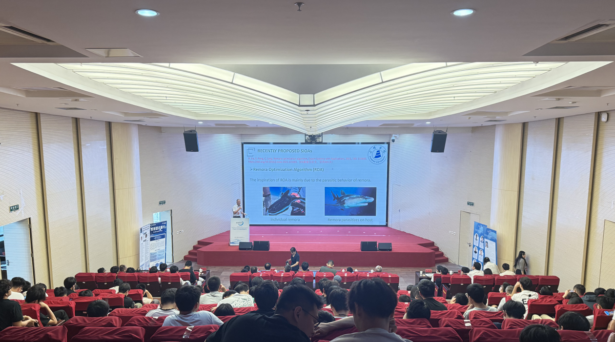 会上,贾鹤鸣教授围绕“群智能优化”这一核心方向展开报告。聚焦群智能优化算法的最新研究进展,系统梳理了粒子群优化、蚁群优化等经典算法的改进思路与创新突破,深入分析了算法在工业生产调度、机械设计优化的应用场景,清晰阐述了算法如何解决复杂工程问题中的多目标优化、动态约束等核心难点。