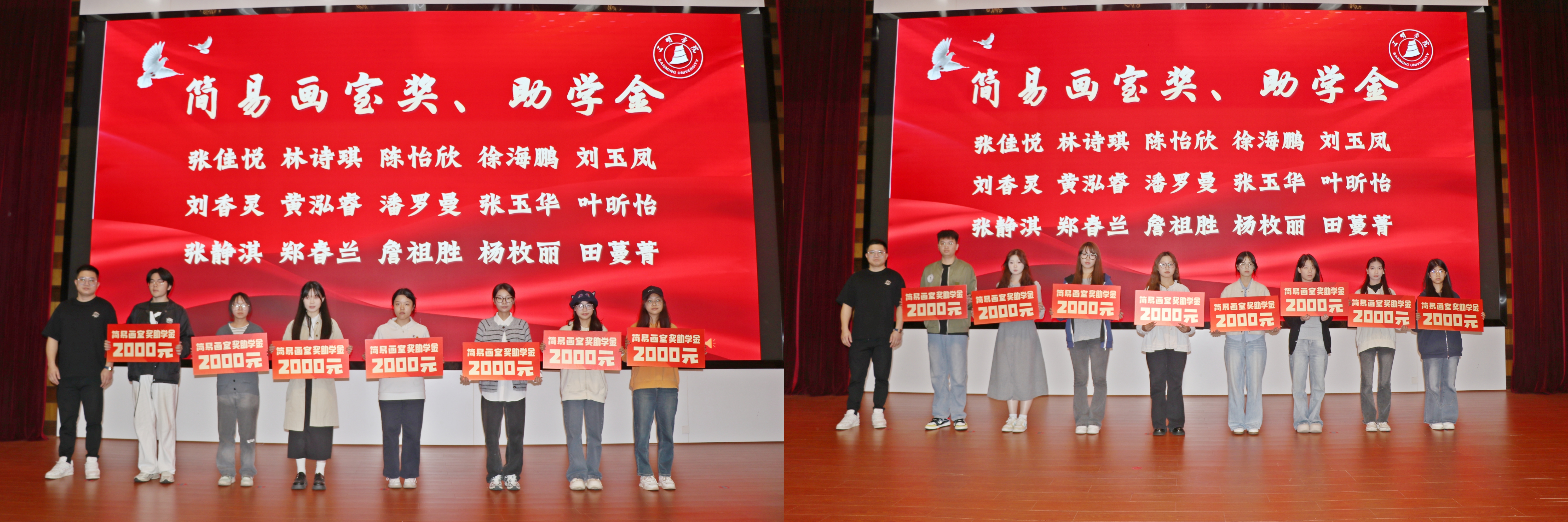 随后举行的“简易画室助学基金”颁奖仪式上,学院为2024-2025学年简易画室奖、助学金获奖学生颁发了荣誉证书。该基金由学院2013届美术学专业优秀校友王再富创办的福建简易画室教育咨询有限公司捐资设立,旨在激励艺术学子专注学业、勇敢追梦。本次颁奖为基金设立以来的第二届,体现了校友对母校发展的持续支持与深厚情谊。