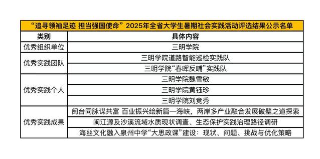 其中,三明学院获评“优秀组织单位”称号;道路智能巡检实践队、“春晖反哺”实践队共计2支队伍荣获“优秀实践团队”称号;魏雪敏、黄钰珍、刘竞秀3名师生获评“优秀实践个人”称号;另有3项社会实践项目《闽台同脉谋共富百业振兴绘新篇--海峡两岸多产业融合发展破壁之道探索》《闽江源及沙溪流域水质现状调查生态保护实践治理路径调研》《海丝文化融入泉州中学“大思政课”建设:现状、问题、挑战与优化策略》入选“优秀实践成果”。