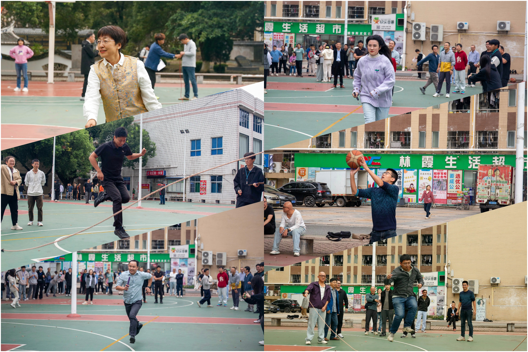 本次趣味运动会设置了八字跳绳、立定投篮、篮球半场迎面接力跑三个项目,以兼具趣味性与挑战性的形式考验团队协作能力与个人运动技巧。在八字跳绳项目中,队员们配合默契,每一次成功的跳跃都是团队协作的完美体现,现场计数声、加油声此起彼伏。在立定投篮项目中,老师们站在罚球线处一展投篮绝技,赢得阵阵欢呼。篮球半场迎面跑项目同样精彩,队员们你追我赶,在交接棒的瞬间传递着速度与激情,全力冲刺的身影成为球场上一道亮丽的风景线。