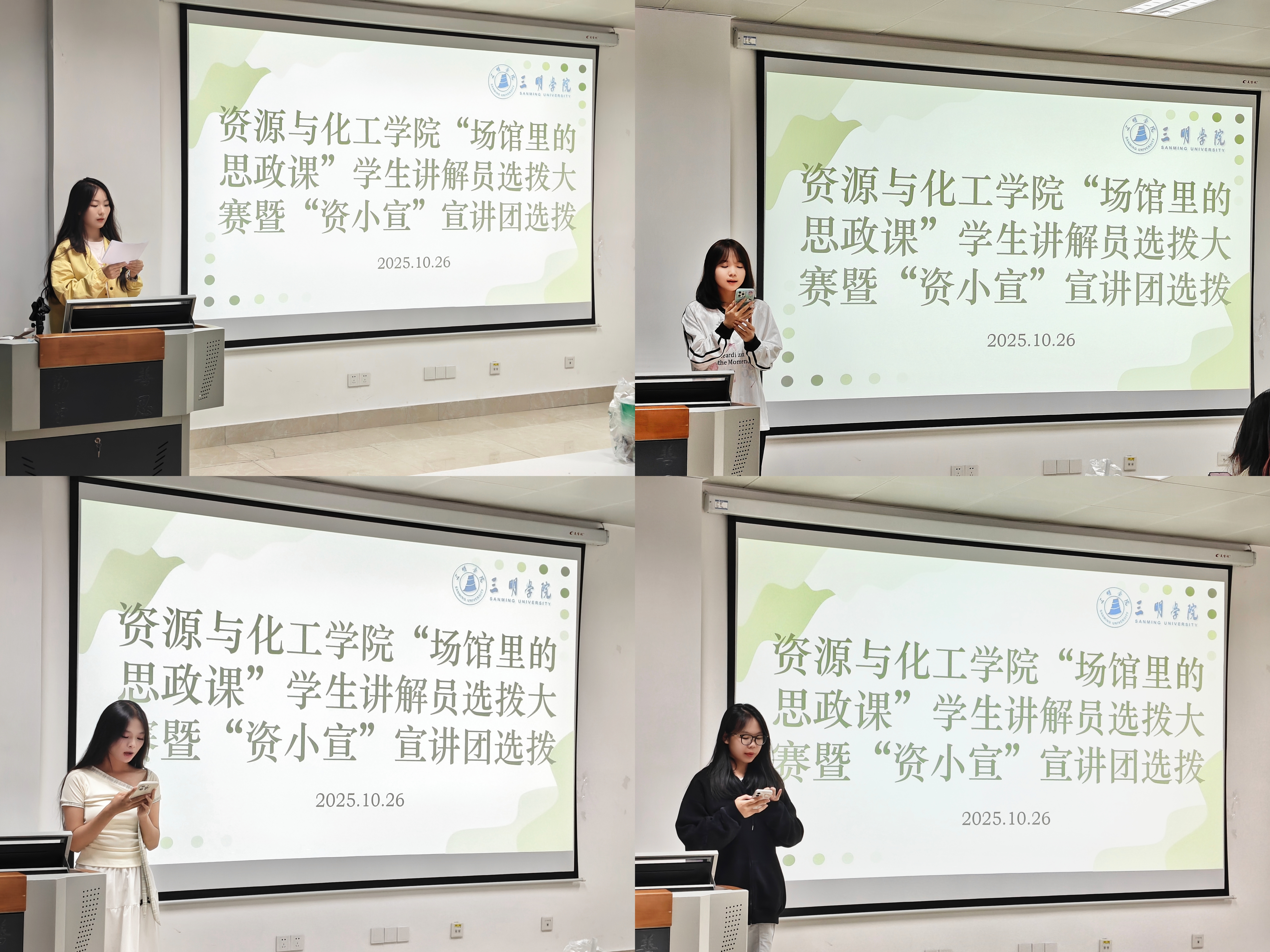 为深耕学校育人场馆资源,将静态建筑与文物转化为鲜活“思政教材”,近日,资源与化工学院联合荷花苑6C楼栋团总支,在工科楼A403教室开展“一站式”学生社区“场馆里的思政课”学生讲解员选拔大赛暨“资小宣”宣讲团选拔活动。