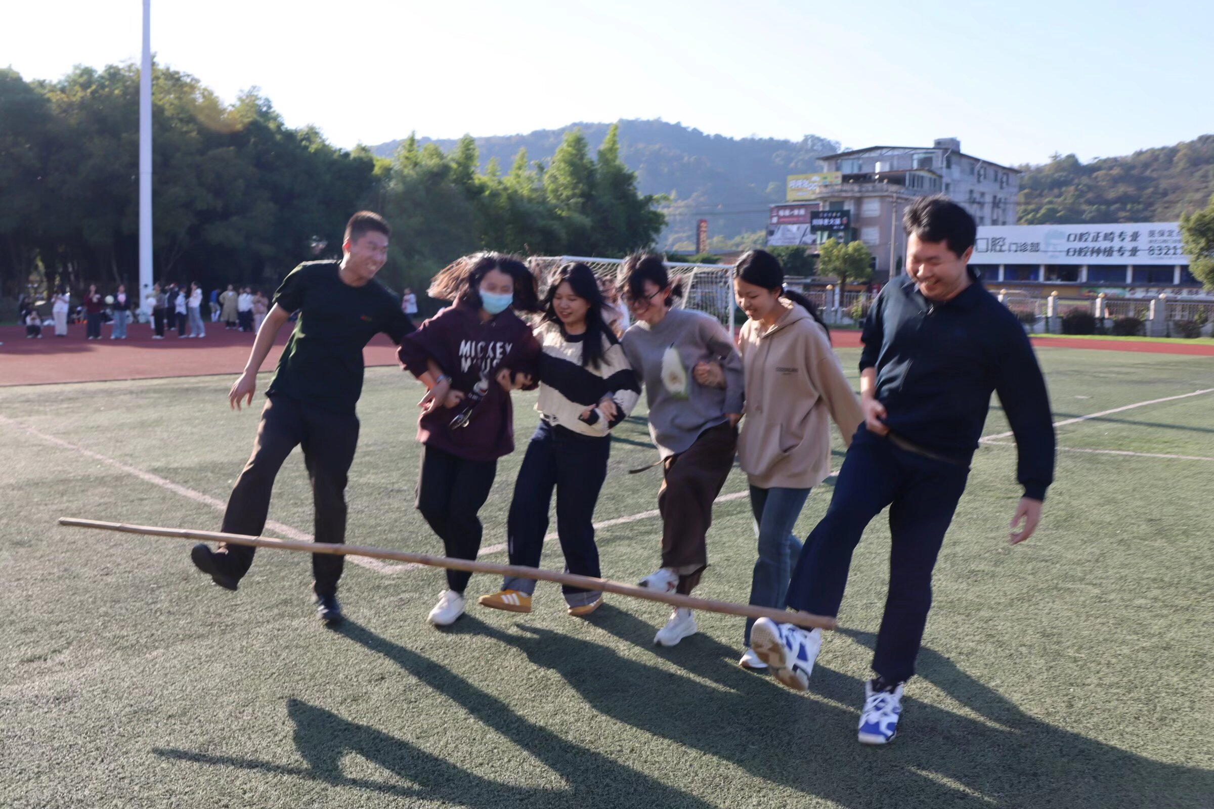 活动现场气氛热烈,各小组队员迅速进入状态,默契配合。“人桥传球”中,队员们肩肩相靠搭建传递通道,小心翼翼守护小球平稳滚动;“勾肩搭脚”项目里,紧扣杆子稳步前行,即便失误也迅速重整旗鼓从头再来;“一圈到底”环节中,大家手拉手围成圆圈,灵活传递呼啦圈,欢声笑语中展现着高效协作的风采。
