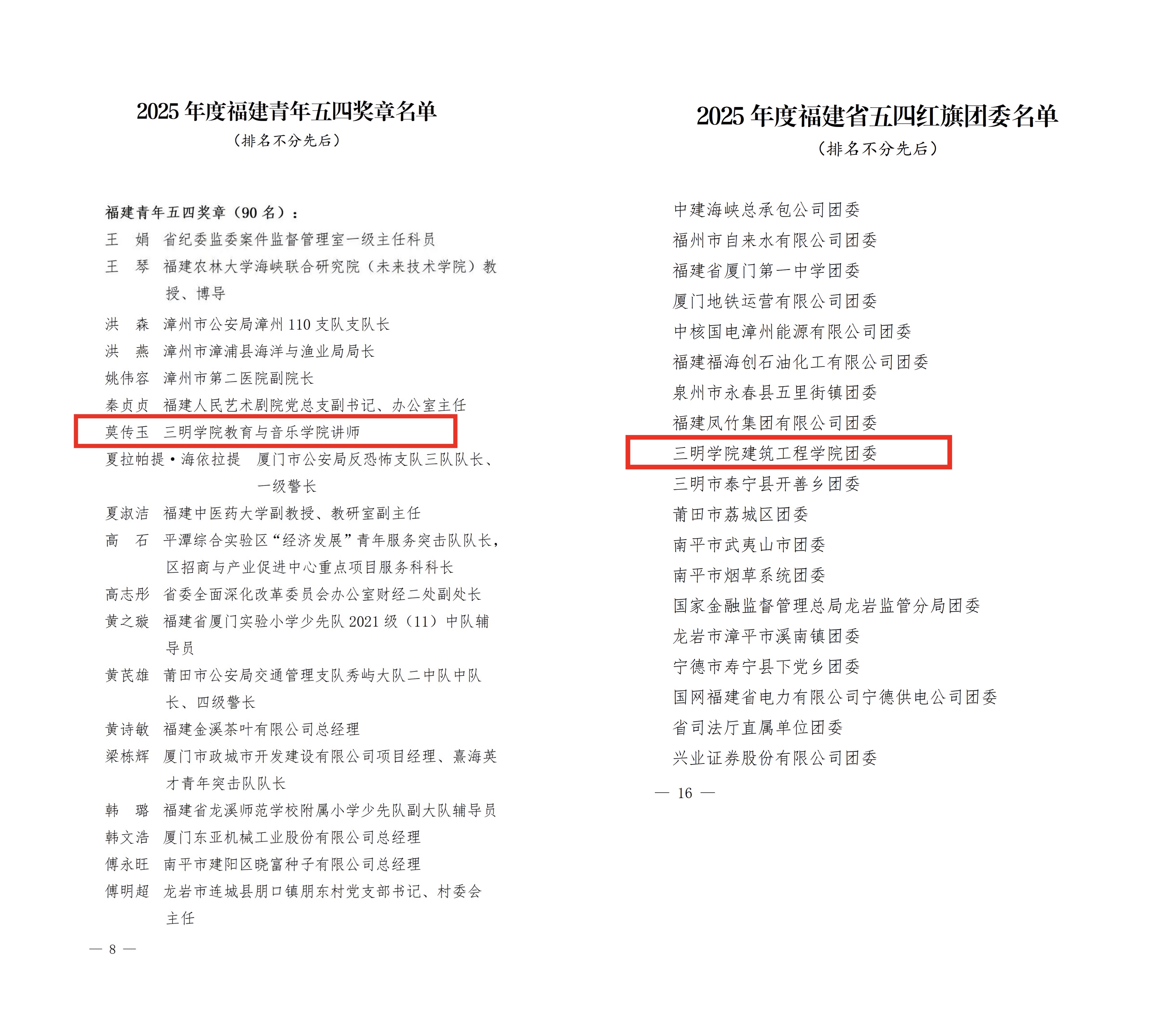 近日,共青团福建省委员会下发⟪2025年度福建青年五四奖章、福建新时代青年先锋、福建省五四红旗团委(团支部)、福建省优秀共青团员、福建省优秀共青团干部拟表彰对象公示⟫中,我校建筑工程学院团委入选“福建省五四红旗团委”拟表彰名单(全省共25个),教育与音乐学院莫传玉老师荣获“福建青年五四奖章”称号。