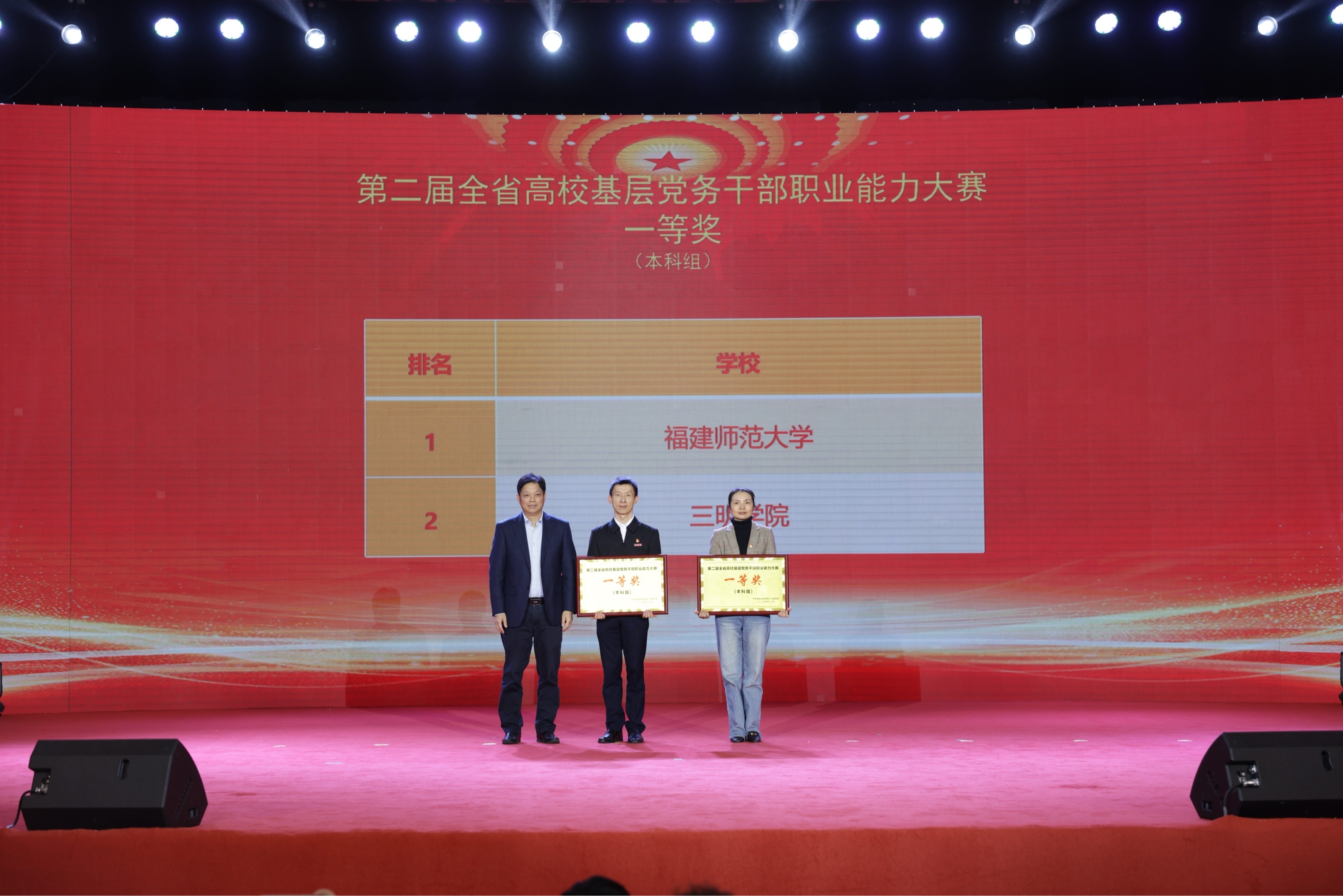 11月28日,由福建省委教育工委主办、福建师范大学承办的第二届全省高校基层党务干部职业能力大赛圆满落下帷幕。三明学院代表队在全省42所本科高校、126名选手的激烈角逐中脱颖而出,一举斩获本科组团体一等奖,同时在“知识测试”“谈心谈话”赛项中揽获4个单项奖,参赛的3名选手全部跻身“知识测试”赛项前10名,1名选手获“谈心谈话”赛项第2名,1名选手获“微党课”赛项第6名。