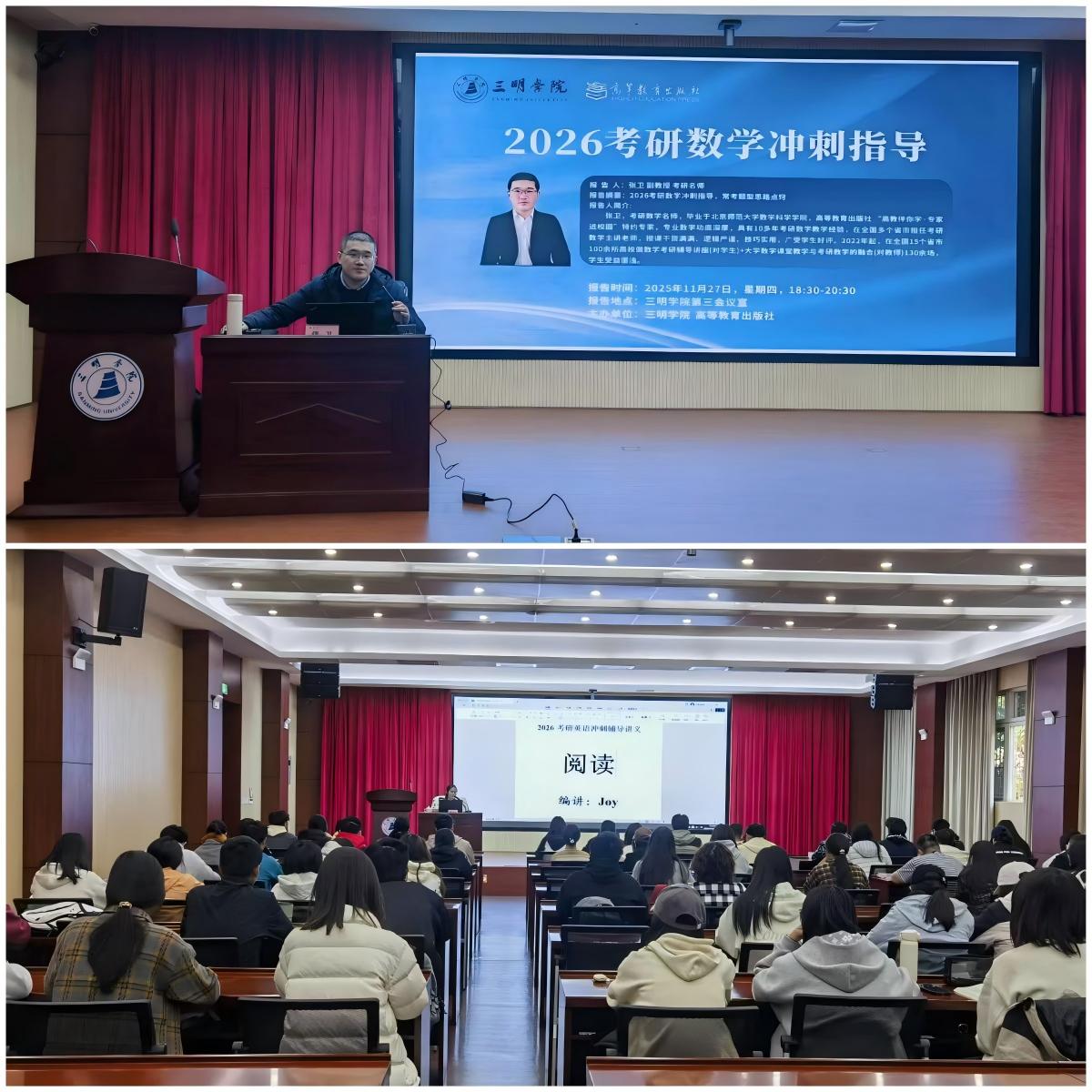 为精准破解考研学子数学和英语备考痛点,助力2026届毕业生高效冲刺,11月27日、29日,教务处邀请高等教育出版社、聚创考研等相关机构专家教师在第三会议室为我校2026届考研学子做数学和英语科目考研冲刺指导专题讲座。 数学专题讲座主要针对考研数学三大核心板块“高等数学”“线性代数”和“概率统计”中的高频考点和解题思路进行重点梳理和解析。英语专题讲座主要以考研英语阅读为难点,分析了考研英语历年阅读题型的变化及出题规律,并结合真题要点讲授几大题型的解题思路和答题策略。 此次讲座精准对接考研学子需求,同学们纷纷表示受益匪浅,两场讲座内容干货密集、指导性极强,对于自己如何抓住最后冲刺阶段有的放矢,提升备考效率与应试能力有极大的帮助。 近年来,教务处持续聚焦考研学子需求,多措并举,加大考研指导力度,进一步整合校内外优质师资,构建“精准化、体系化、常态化”的考研服务矩阵,为考研学子保驾护航。 (教务处/供稿)