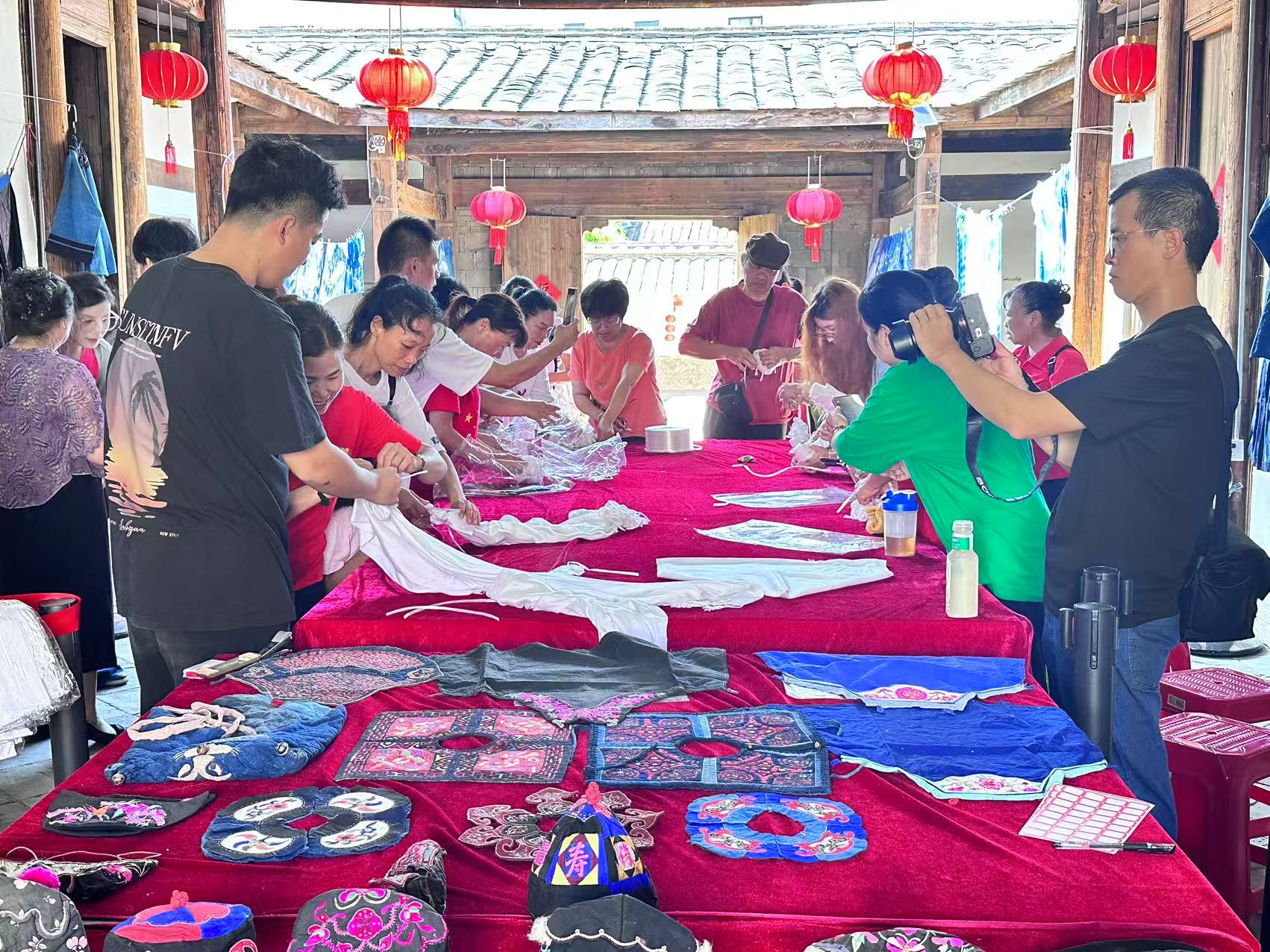 沙县小吃城内,“客韵华裳”实践队的蓝染展示台前围满了游客。队员们一边演示扎染技法,一边讲解客家服饰文化的历史渊源。一块块素布在巧手翻飞间变幻出瑰丽图案,引得游客纷纷驻足体验。“没想到传统技艺可以这么美!”一位参与体验的游客赞叹道。