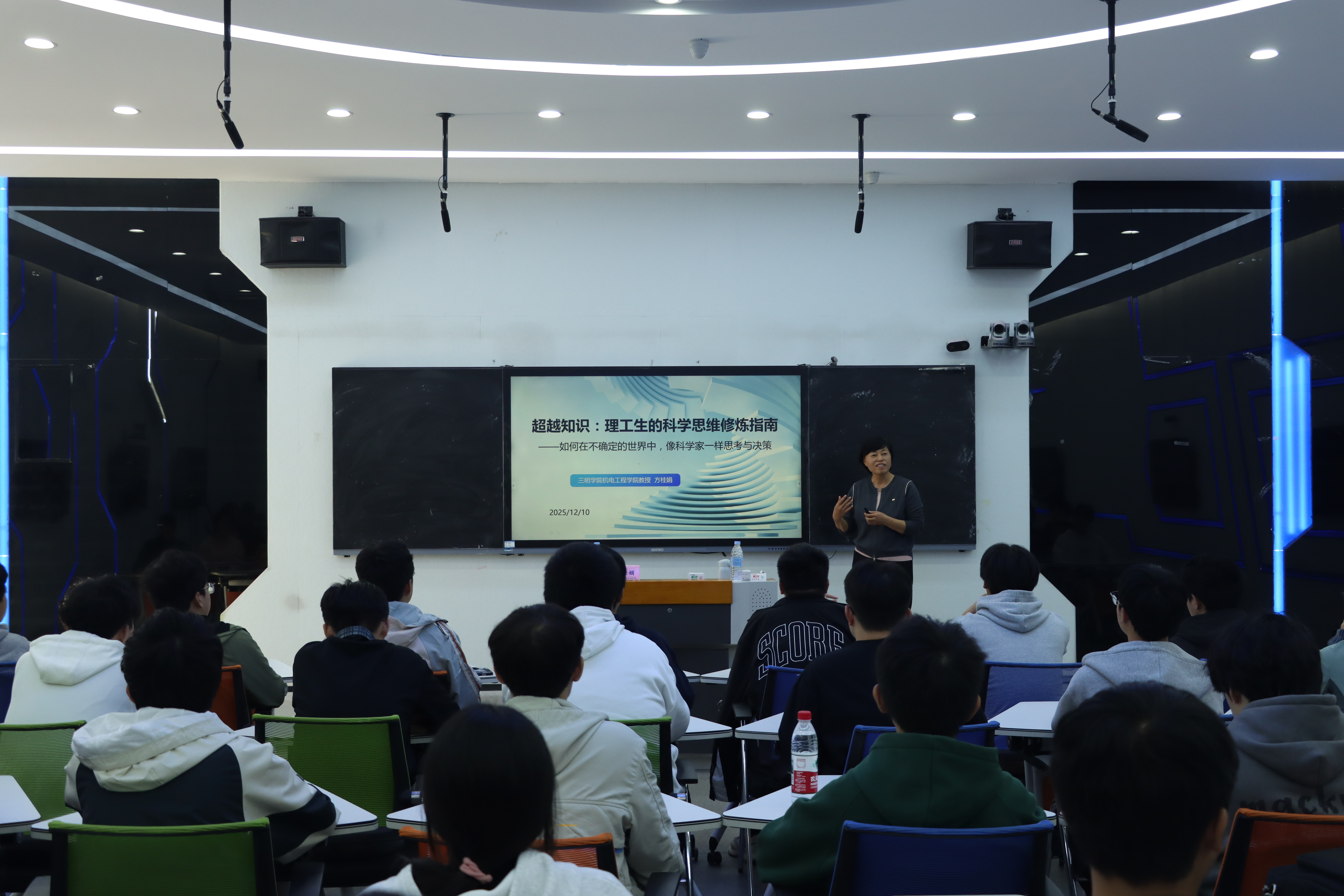 方桂娟教授以《超越知识:理工生的科学思维修炼指南——如何在不确定的世界中,像科学家一样思考与决策》为主题,结合自身丰富的科研教学经验,围绕“基石篇——科学思维的四大支柱”“实战篇——识别与破解常见的思维陷阱”“升华篇——科学思维与理工生的未来”三个方面展开,通过丰富的实例与深入的分析,阐释了科学思维对理工科学生成长成才的重要意义,引导学生建立严谨的理性思考习惯,提升在复杂情境下的判断与决策能力。