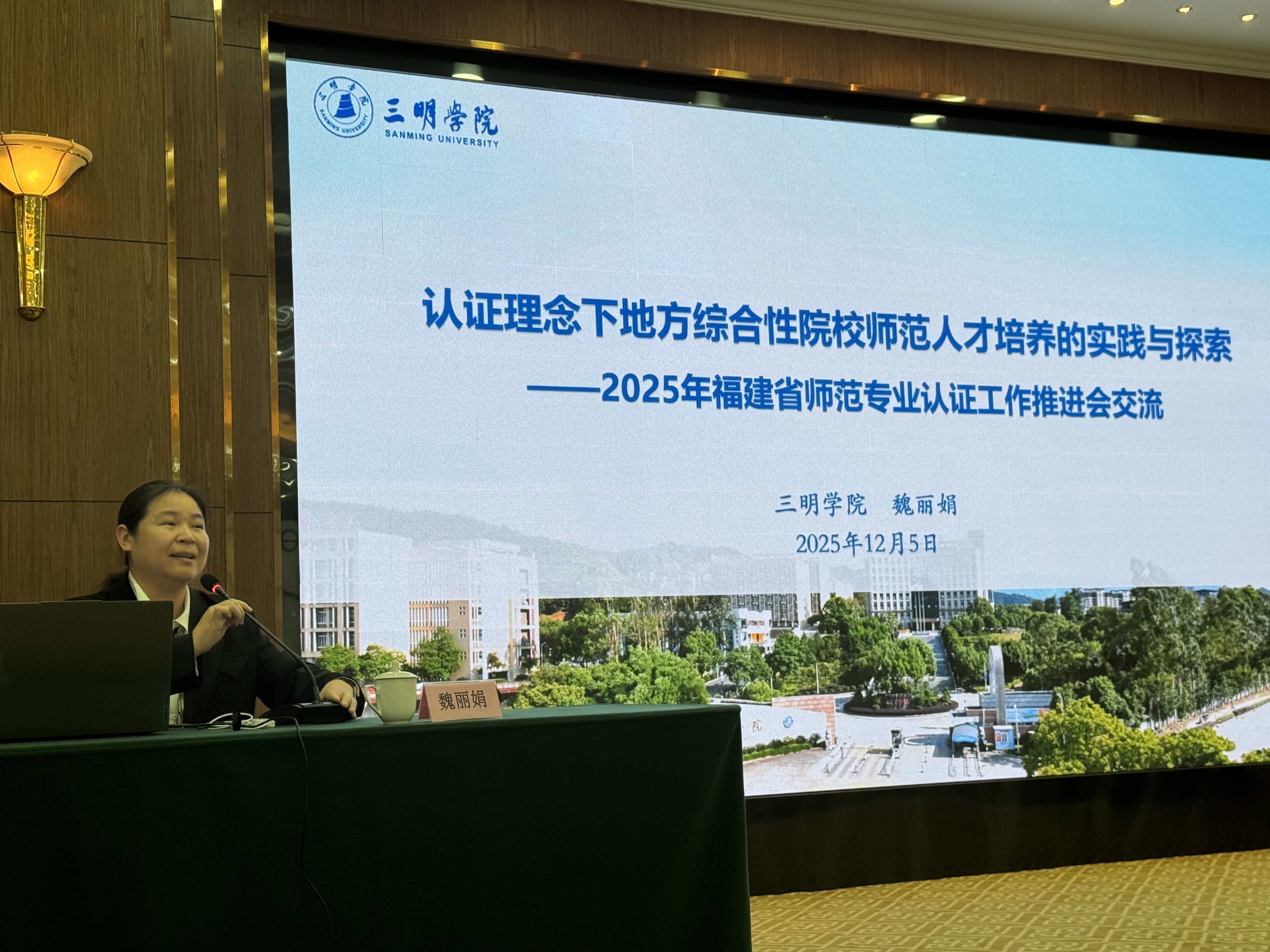 12月5日,2025年福建省师范专业认证工作推进会在福州举行,会议由福建省教育评估研究中心主办,旨在推进师范类专业认证整改工作,提升师范专业建设与人才培养质量,为构建福建特色、国内一流的教师教育质量监测认证体系夯实基础。全省开设师范类专业高校代表参会,我校受邀作师范专业建设主题分享。