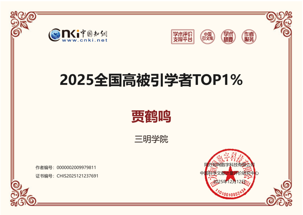 近日,中国知网的中国科学文献计量评价研究中心公布了“2025全国高被引学者”名单。信息工程学院贾鹤鸣教授入选“2025全国高被引学者TOP1%”。