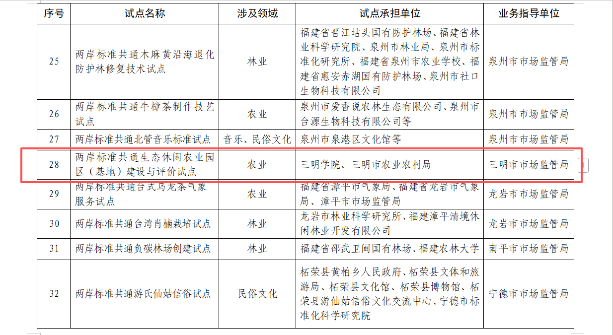 近日,由福建省市场监管局下达的第三批两岸标准共通试点项目中,三明学院经济与管理学院与三明市农业农村局共同承担的“两岸标准共通生态休闲农业园区(基地)建设与评价试点”项目获批立项。