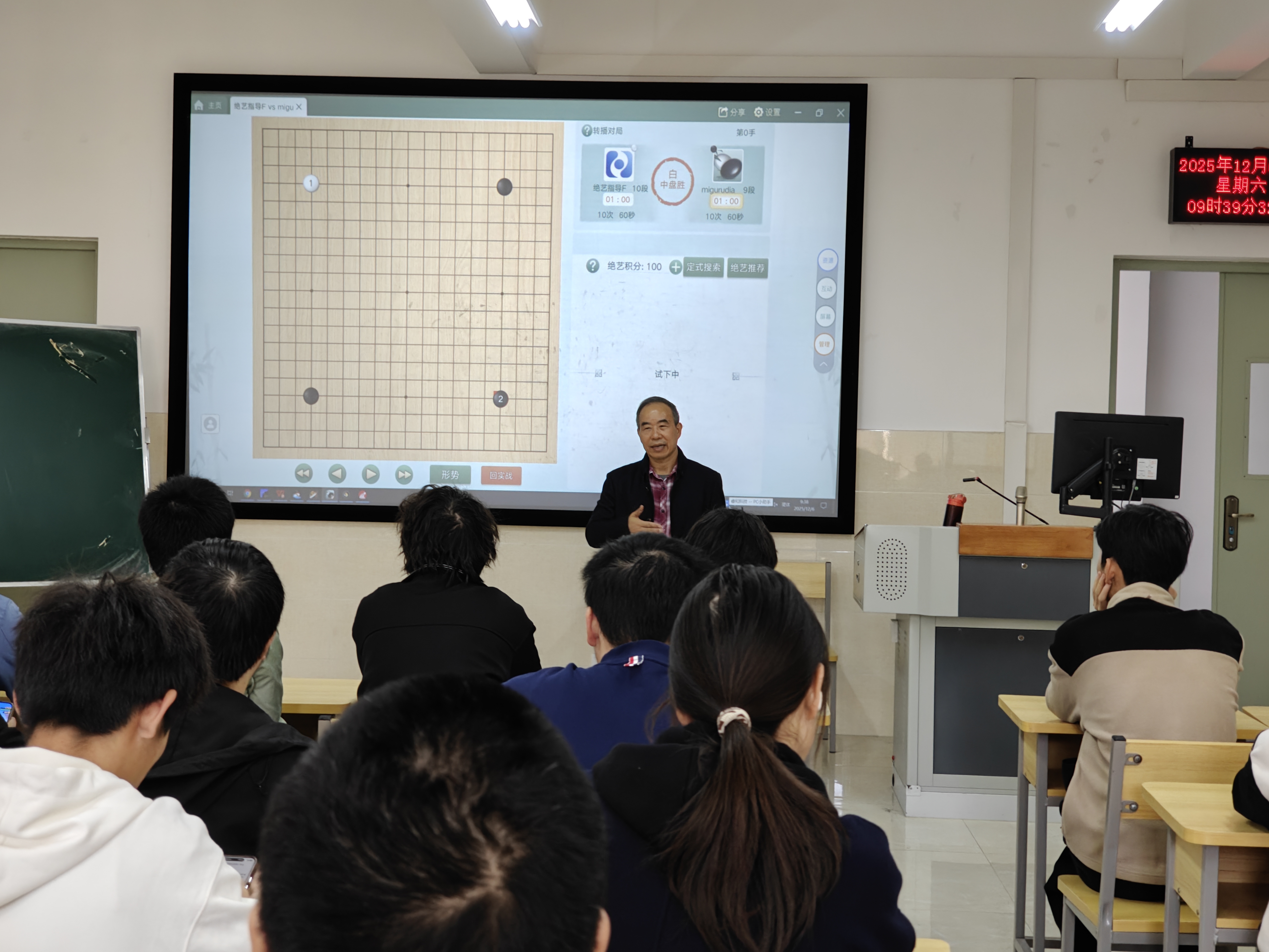 活动现场氛围庄重而轻松。苏老师借助大屏幕上的对弈实例,从围棋的历史起源与基本规则讲起,逐步解析棋子布局、死活题解题等核心技巧,并巧妙融合围棋中蕴含的逻辑思维与人生哲学,以通俗易懂的语言,将抽象的战略战术娓娓道来,引人入胜。台下同学们全神贯注,时而凝神聆听,时而沉思棋路,记录重点内容。互动环节中,苏老师耐心解答大家的疑问,从基础落子到高阶思路,层层展开讲解,现场交流气氛热烈。参与同学不仅学到了围棋知识,也深切体会到中华传统棋艺的深厚魅力。