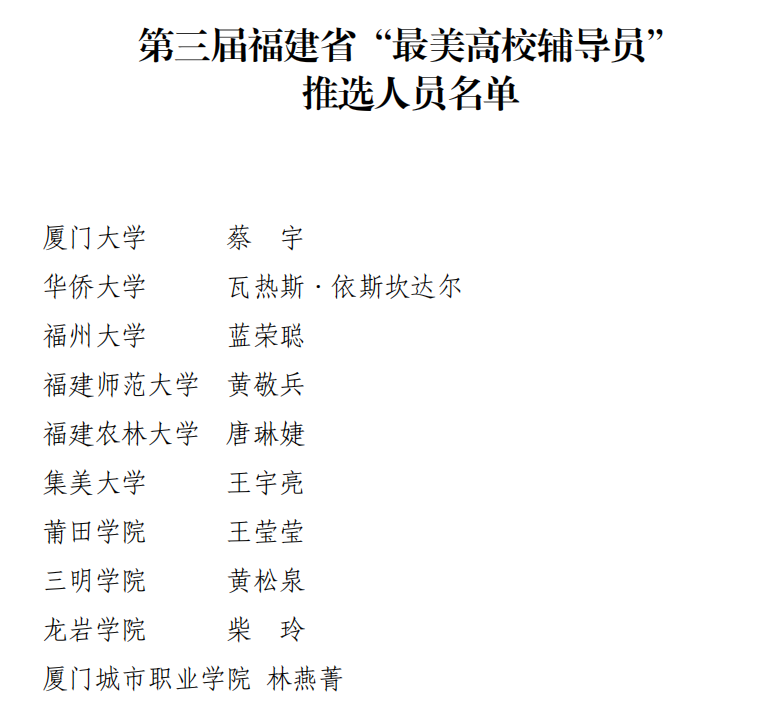 据悉,此次评选活动坚持培优选优、宁缺毋滥的原则,按照政治信念坚定、师德师风优良、素质能力过硬、育人实效突出、敢于担当作为等推选条件,共推选出第三届福建省“最美高校辅导员”10人。