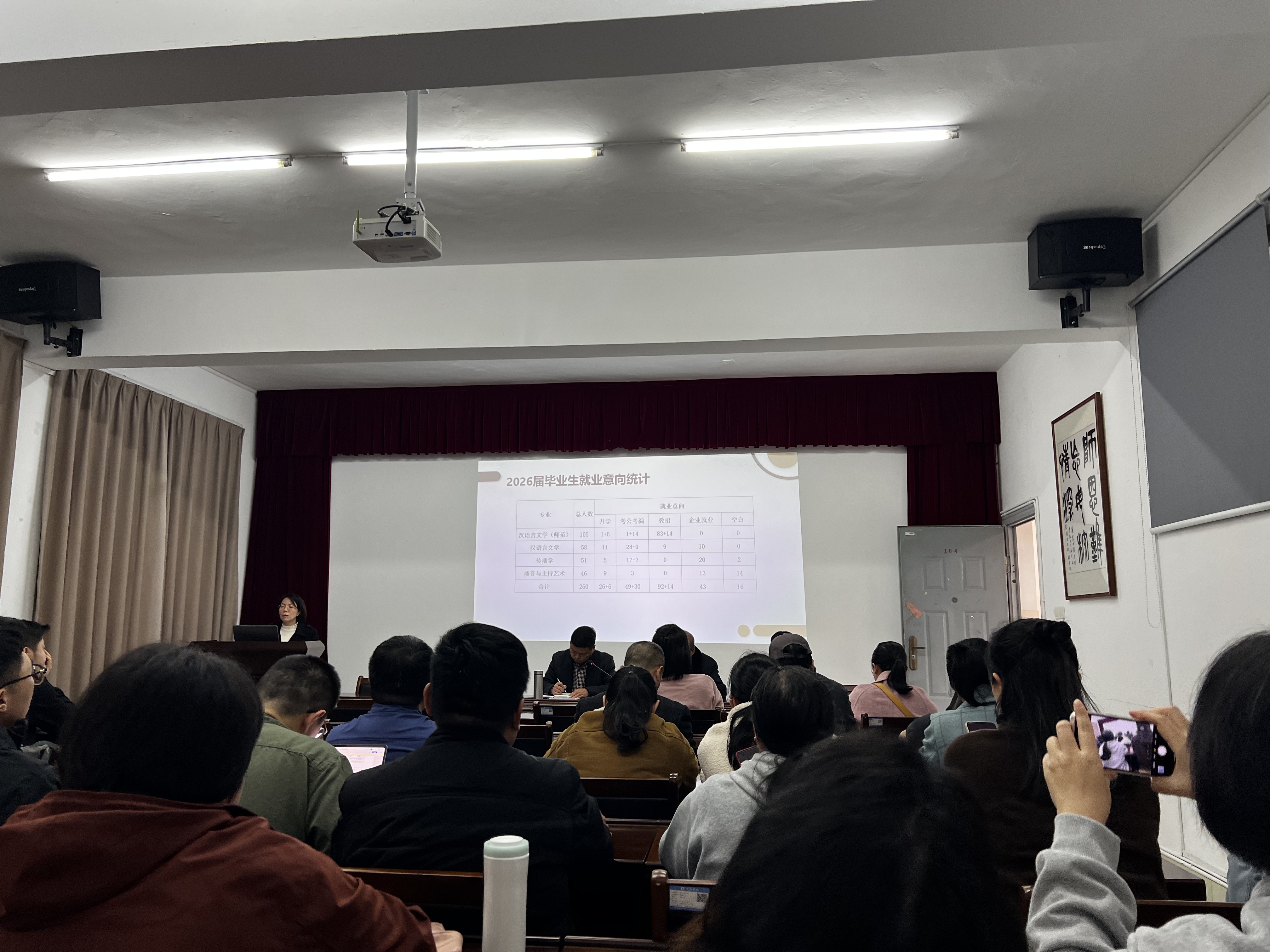 12月24日,文化传播学院在鸿文楼(一)104召开2026届毕业生就业创业工作会议,全面总结学院2025届毕业生就业创业工作,并对2026届工作进行动员部署。学院党政领导班子成员、全体教职工参加会议。
