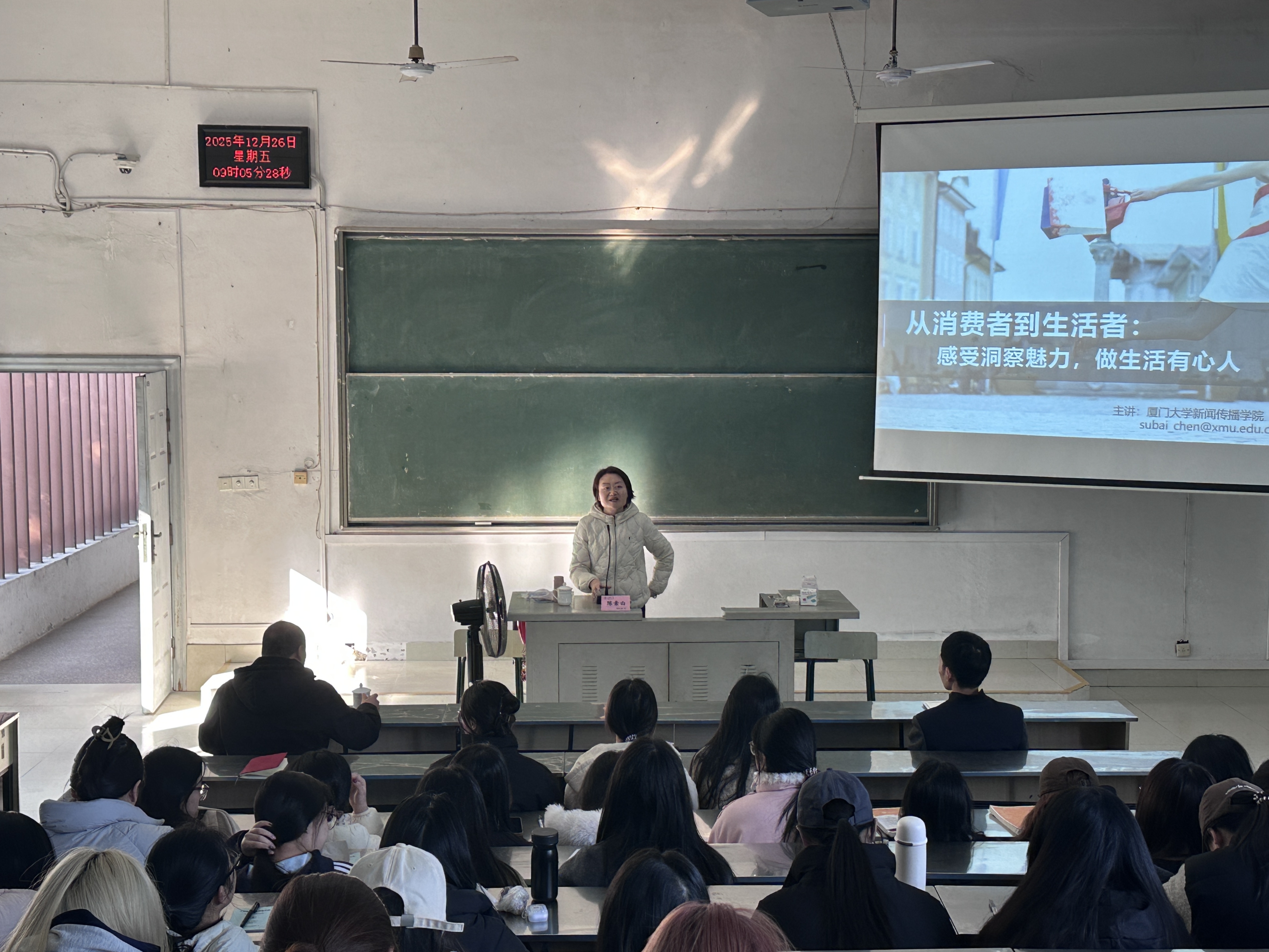 12月26日上午,厦门大学新闻传播学院教授、博士生导师陈素白应邀在鸿文楼(一)101教室开展专题讲座,以“从消费者到生活者:感受洞察魅力,做生活有心人”为主题,为现场师生带来一场兼具理论深度与实践价值的分享。