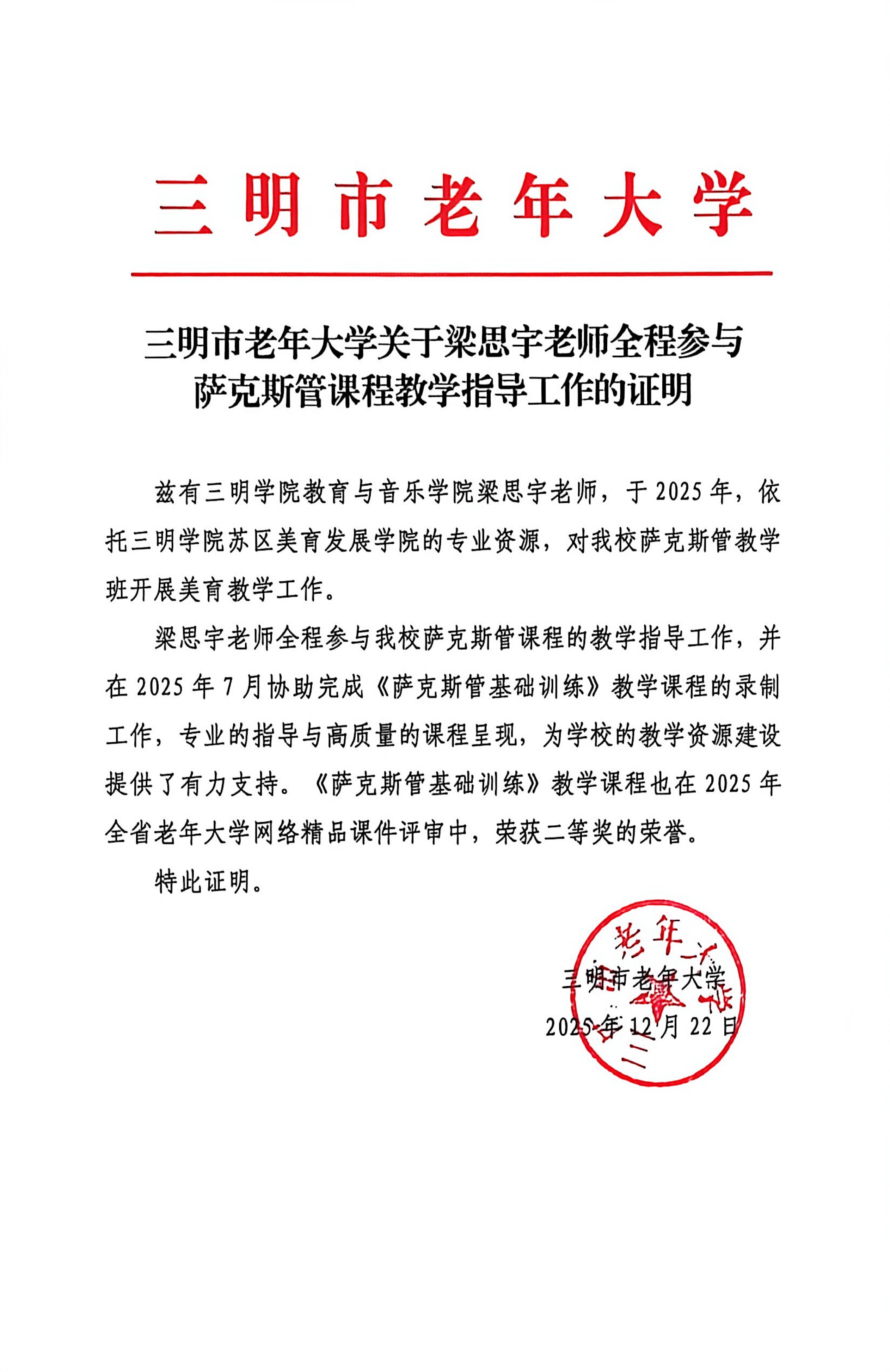 近日,三明学院教育与音乐学院、苏区美育发展学院帮扶三明市老年大学研发的《萨克斯管基础训练》数字教材课件,在2025年全省老年大学网络精品课件评选中荣获二等奖。这一成果是校地美育帮扶的扎实体现,也是学院推动产学研融合、以实践服务地方老年教育的生动案例。