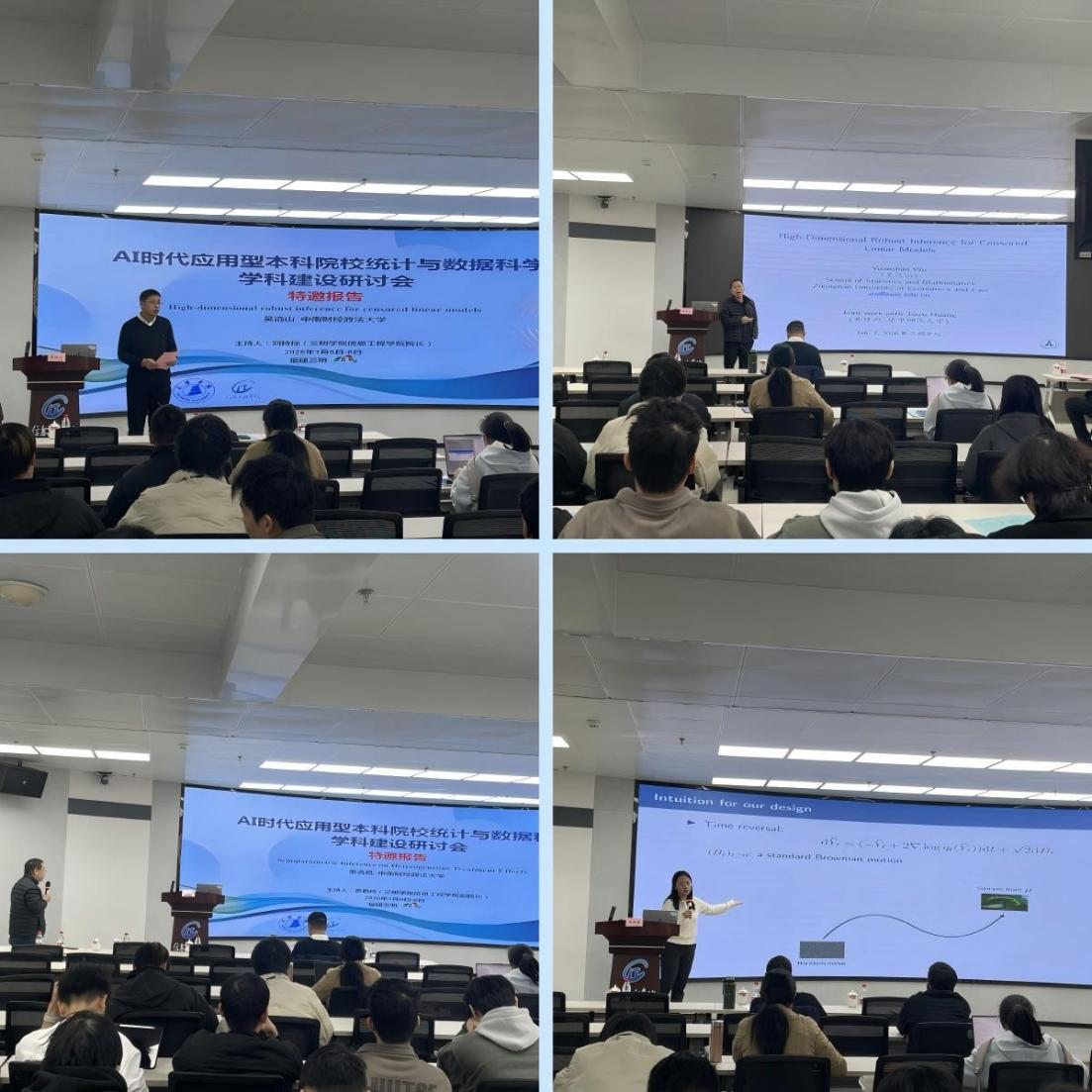 本次研讨会围绕统计与数据科学学科建设路径、人才培养模式创新、与人工智能等学科交叉融合机制等核心议题展开深入交流探讨。特邀报告环节,中南财经政法大学吴远山教授以“High-dimensional robust inference for censored linear models”为题,深入解析高维删失线性模型的稳健推断方法,分享了最新研究成果与实践应用案例;中南财经政法大学余吉昌副教授的“Semiparametric Inference on Heterogeneous Treatment Effects”报告,聚焦异质处理效应的半参数推断问题;康奈尔大学吴雨晨助理教授围绕“Recent advances in diffusion models”,系统介绍了扩散模型的前沿进展及在数据科学领域的创新应用。整场报告不仅传递了前沿学术理念,更搭建了师生与学界专家直接对话的平台,让师生在学术碰撞中拓宽视野、增长见识。