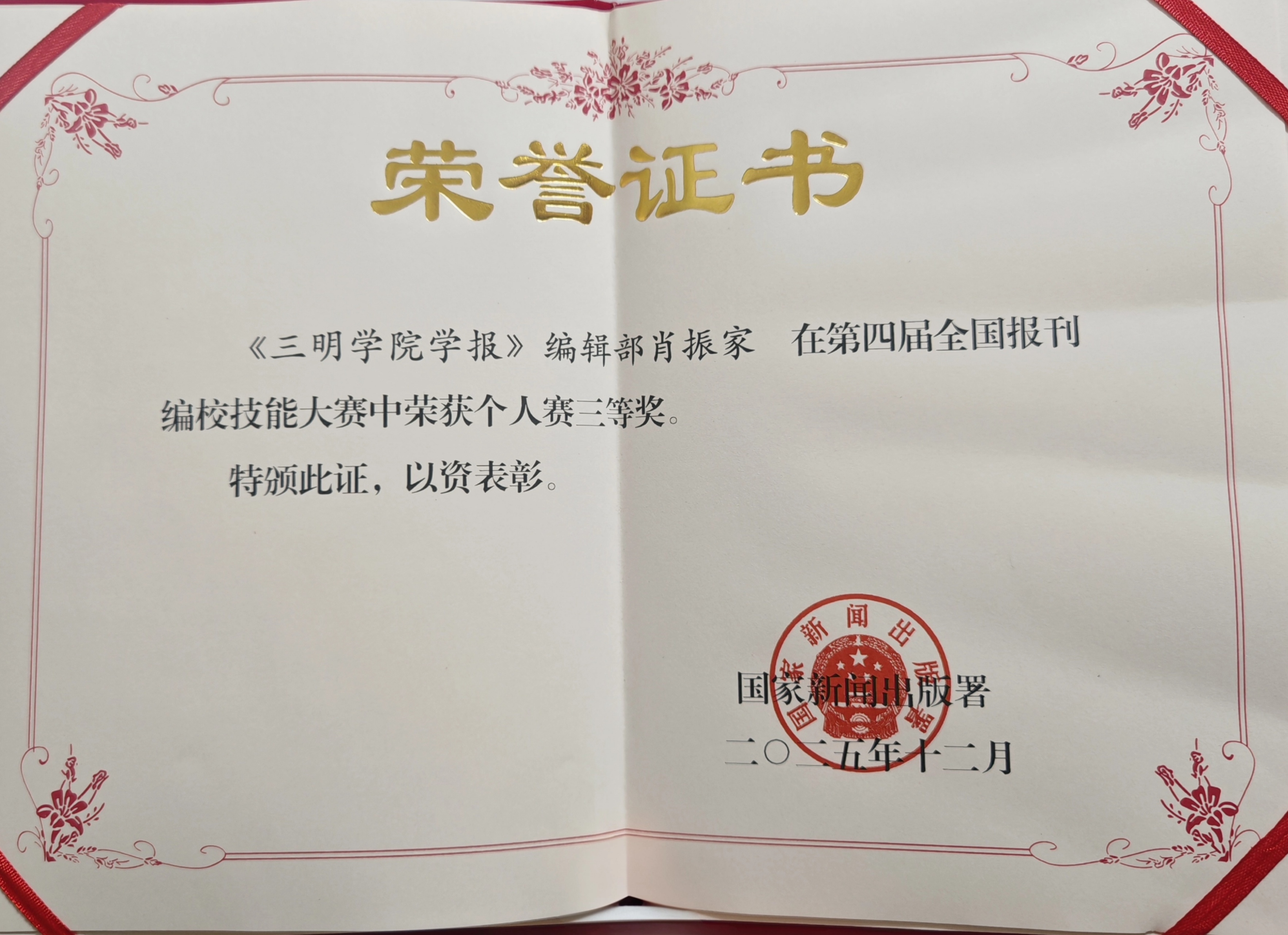 近日,国家新闻出版署发布了《关于表彰第四届全国报刊编校技能大赛获奖选手、团队和单位的决定》(国新出发〔2025〕21号)。在此次全国性高水平专业技能竞赛中,《三明学院学报》编辑部表现突出,刘建朝、肖振家凭借扎实的专业功底和出色的现场发挥,双双荣获个人赛三等奖,在全国舞台上展现了我校编辑人员的严谨作风与专业素养。