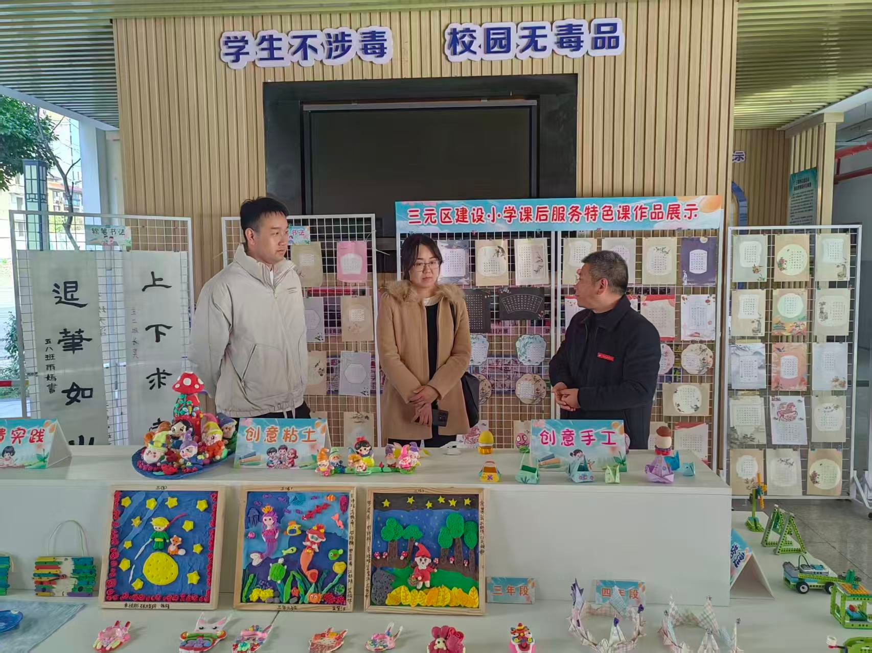 在展演正式启幕前,两位老师与建设小学师生代表一同走进课后服务特色课作品展示区,沉浸式感受孩子们在美育实践中的创意与成长。在成果展示区,创意黏土、非遗扎染、书法作品等七大类别作品整齐陈列,琳琅满目。这些作品不仅展现了孩子们的动手能力与想象力,更凸显了校地协同构建“课程教学 + 实践创作”美育体系的显著成效。