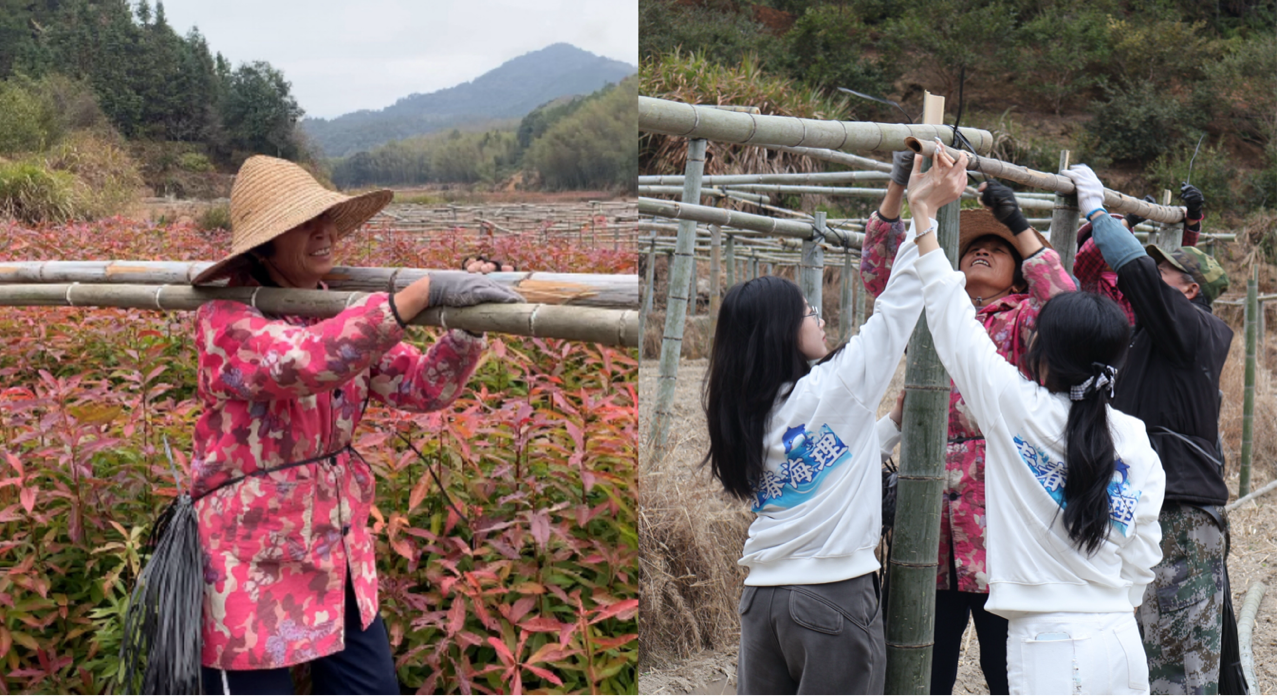 在清流县嵩口镇的农田里,带队教师亲自示范,指导队员们规范测量架距、掌握绑缚技巧:“丝瓜架的稳定性关系到后期挂果,要注意杆体的垂直与受力。”队员们与农户携手合作,顺利完成丝瓜种植架的搭建。此次种植借鉴了台湾精致农业的精细化标准,让同学们在实践中深刻体会到细节管理对农业提质增效的重要意义。