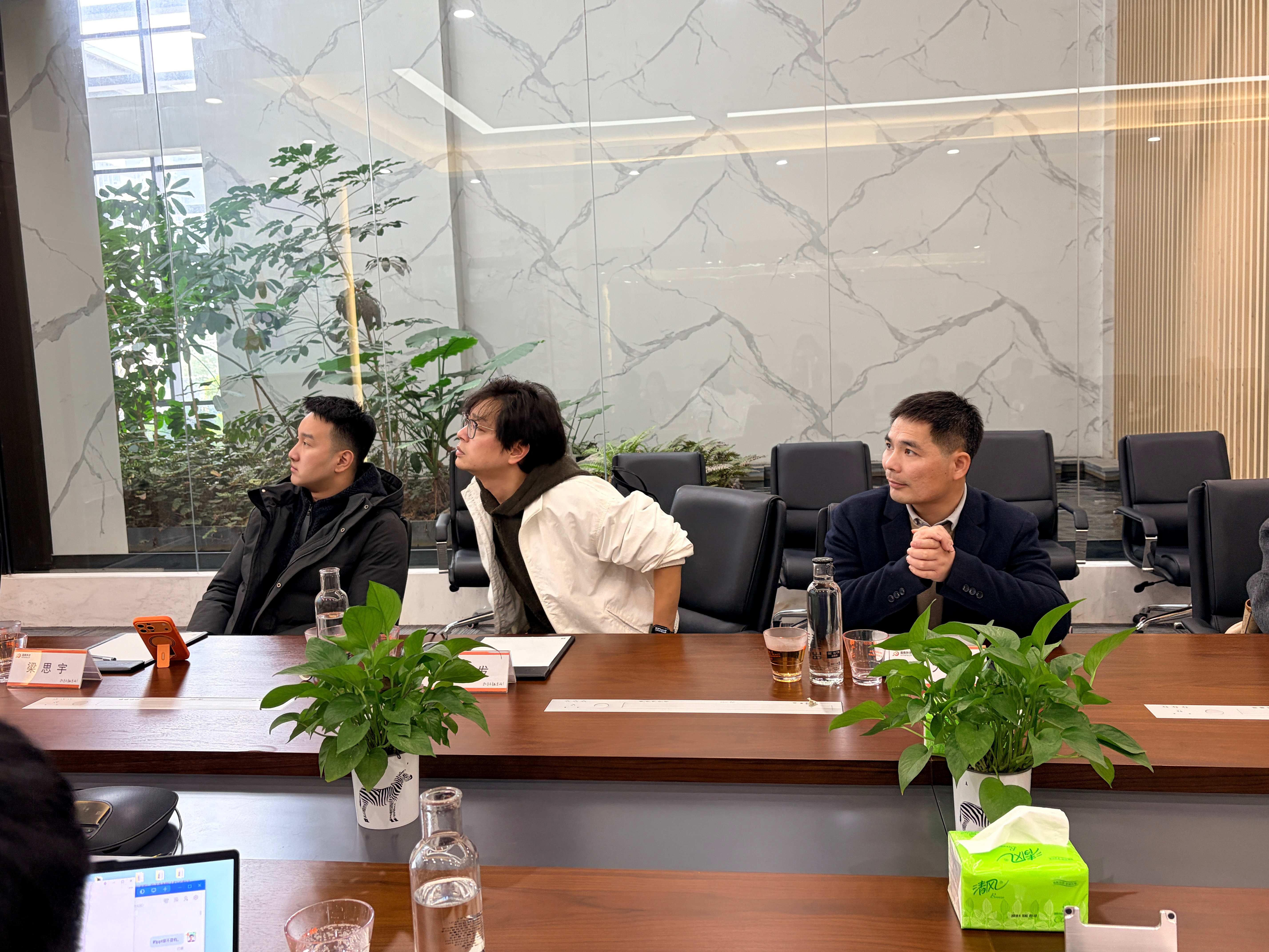 调研期间,盈趣科技总裁助理陈建成、北洋脑机院可穿戴脑机中心执行主任冯超等企业负责人热情接待了调研组。在展厅及实验室,陈建成与冯超详细介绍了盈趣科技在脑机接口、智慧健康以及数字疗法等领域的最新研发成果与战略布局。技术人员现场演示了以Xmuse可穿戴设备及音乐疗愈实验平台为核心的解决方案,生动展示了如何通过高科技手段采集脑电波数据,并将其转化为可视化的音乐疗愈反馈,让调研组一行对“科技+艺术”的跨界融合有了直观且深刻的认识。
