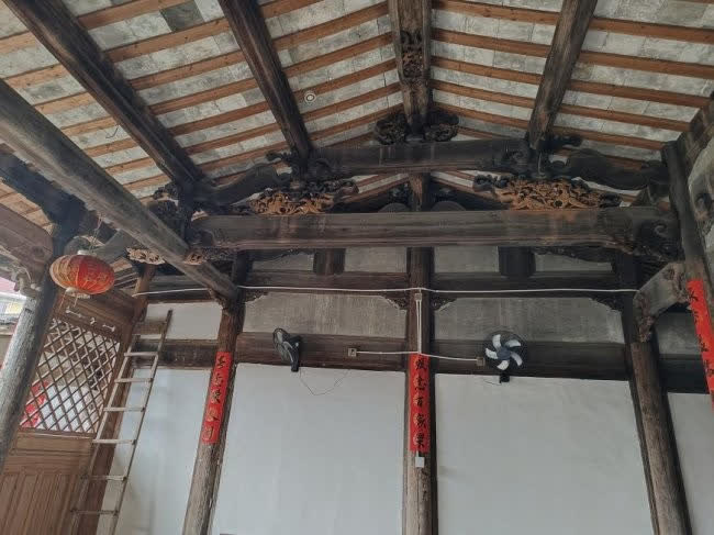 土堡深处,一砖一瓦皆藏乾坤。在沙县水美土堡群,双吉、双兴、双元三座土堡依山傍水,河卵石地基扎实稳固,红土掺砂石夯筑的丈余厚堡墙坚不可摧,本地杉木架构的梁枋错落有致,完美融合防御与居住功能。学子们循着梁柱纹理细细探寻,中厅正平柱“象球穿”雕刻寓意“太平有象”,对称花托上“吉祥”“如意”纹样清晰可辨,柱础“暗八仙”图案承载美好祈愿,天井葫芦形进水口寄托“福禄绵长”愿景,跑马道上的菱形射击孔与碉楼遗迹,直观复刻着明清宗族聚居的防御智慧。“土堡建造技艺与台湾传统聚落防御设计一脉相承,这是两岸文化同根同源的生动见证。”台湾籍教师胡博士抚摸着历经百年风雨的杉木梁枋,语气中满是感慨。