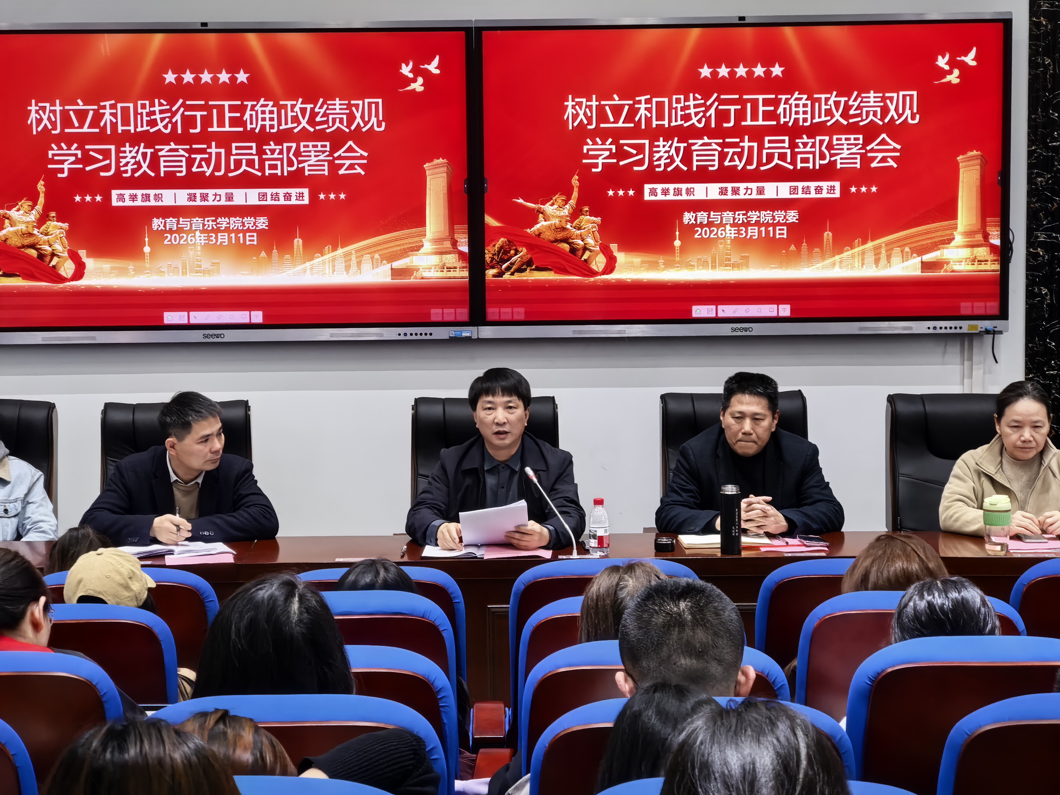 为深入学习贯彻党的二十届四中全会精神,全面落实习近平总书记关于树立和践行正确政绩观的重要论述,3月11日,教育与音乐学院召开树立和践行正确政绩观学习教育动员部署会,统一安排学习教育工作。学院领导班子、全体党员教师参会。