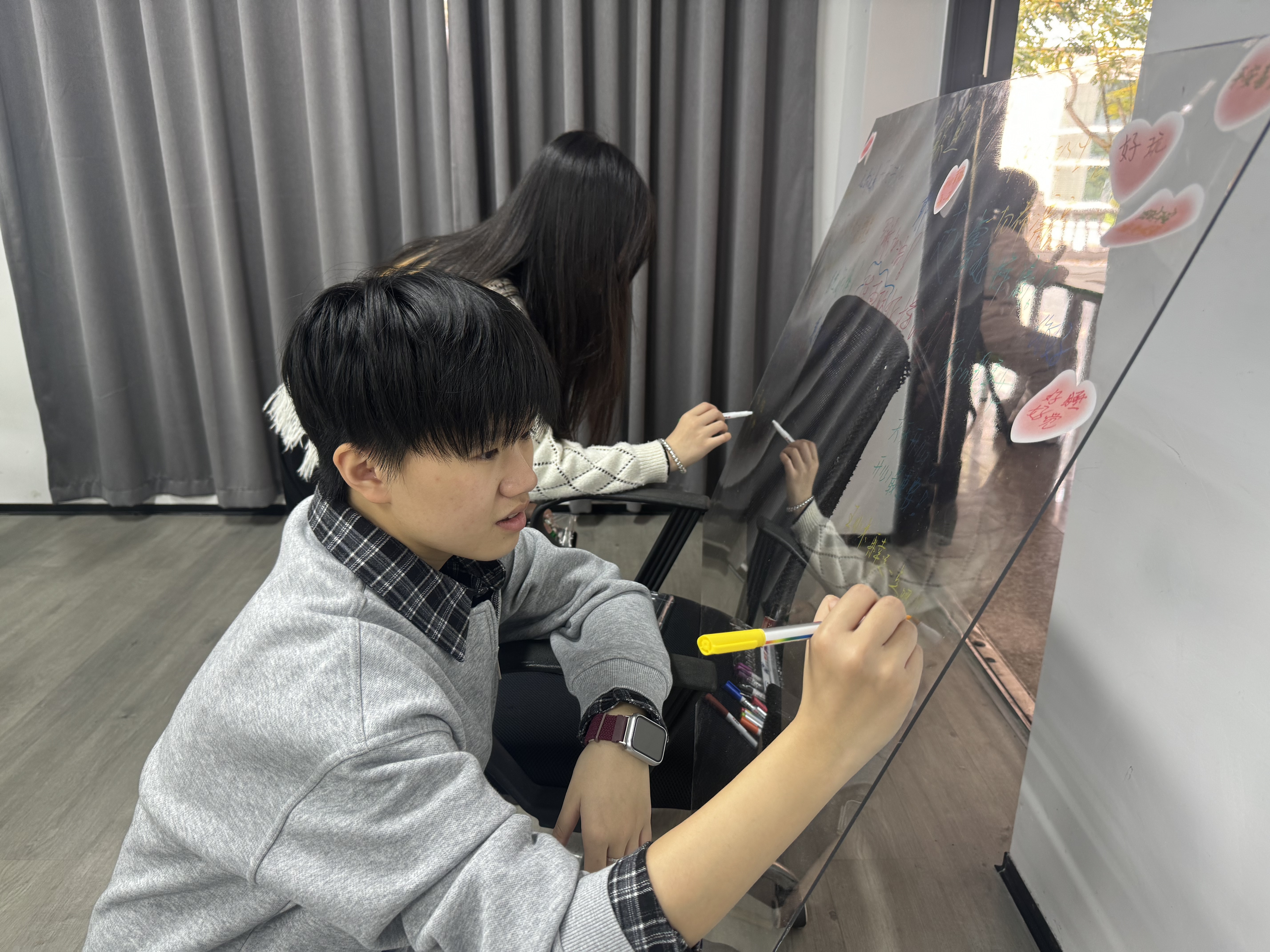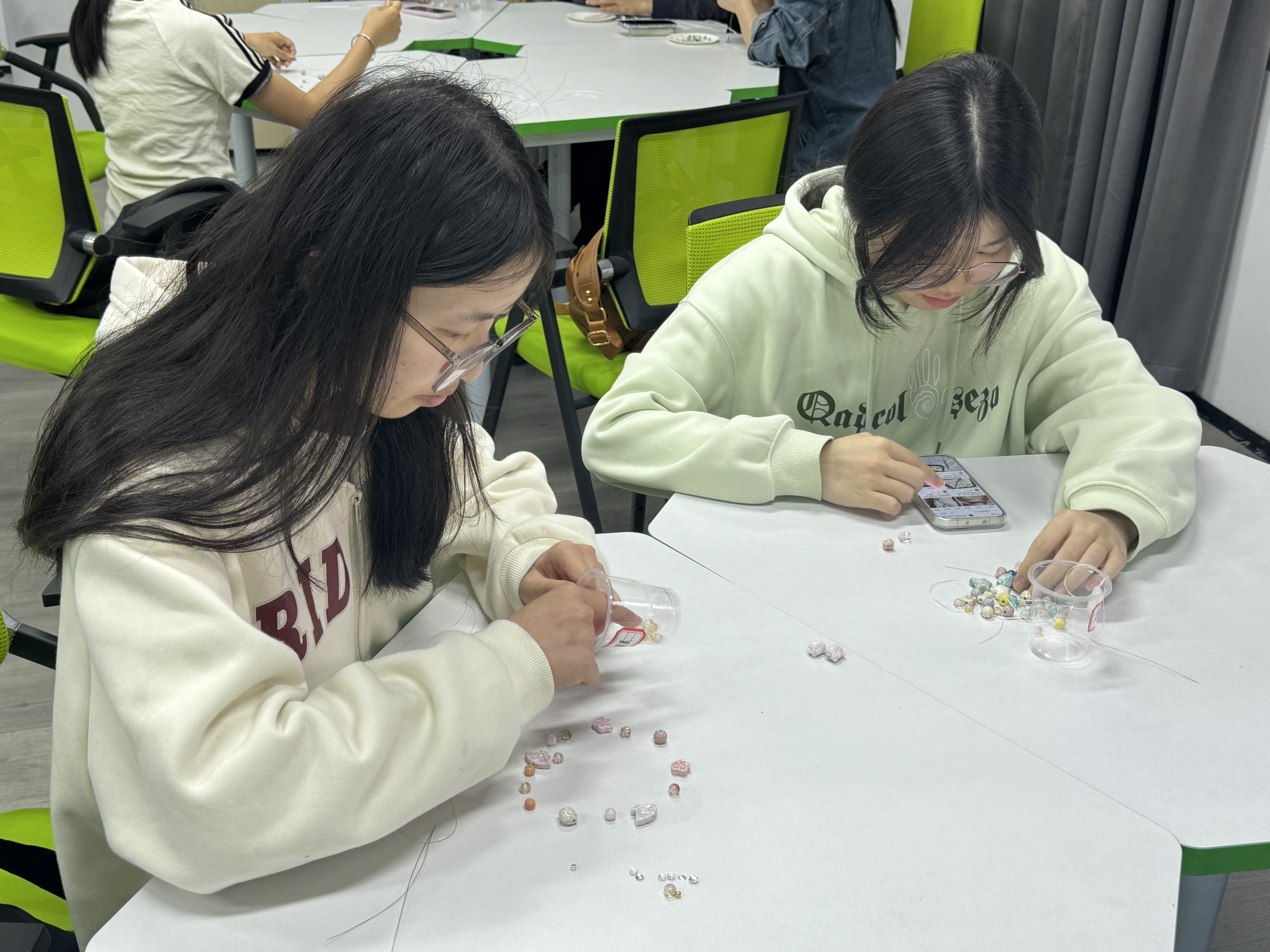 本次活动设置“珠韵润心,手作悦己”与“暖言绘心,夸赞同行”两大环节,引导学生在动手实践中舒缓压力、发现自我。同学们在串珠DIY过程中专注选珠、编织,将劳动实践与审美表达相结合,制作出手串、挂饰等小物件,作为自我鼓励的信物。与此同时,夸夸墙成为活动的另一大亮点。同学们利用马克笔、贴纸等材料,在亚克力板上书写下自我鼓励、赞美他人的暖心语录。这些语录或幽默风趣,或真挚感人,为学生们提供了一个表达自我、传递正能量的平台,在无形中增进了同辈之间的联结与理解。