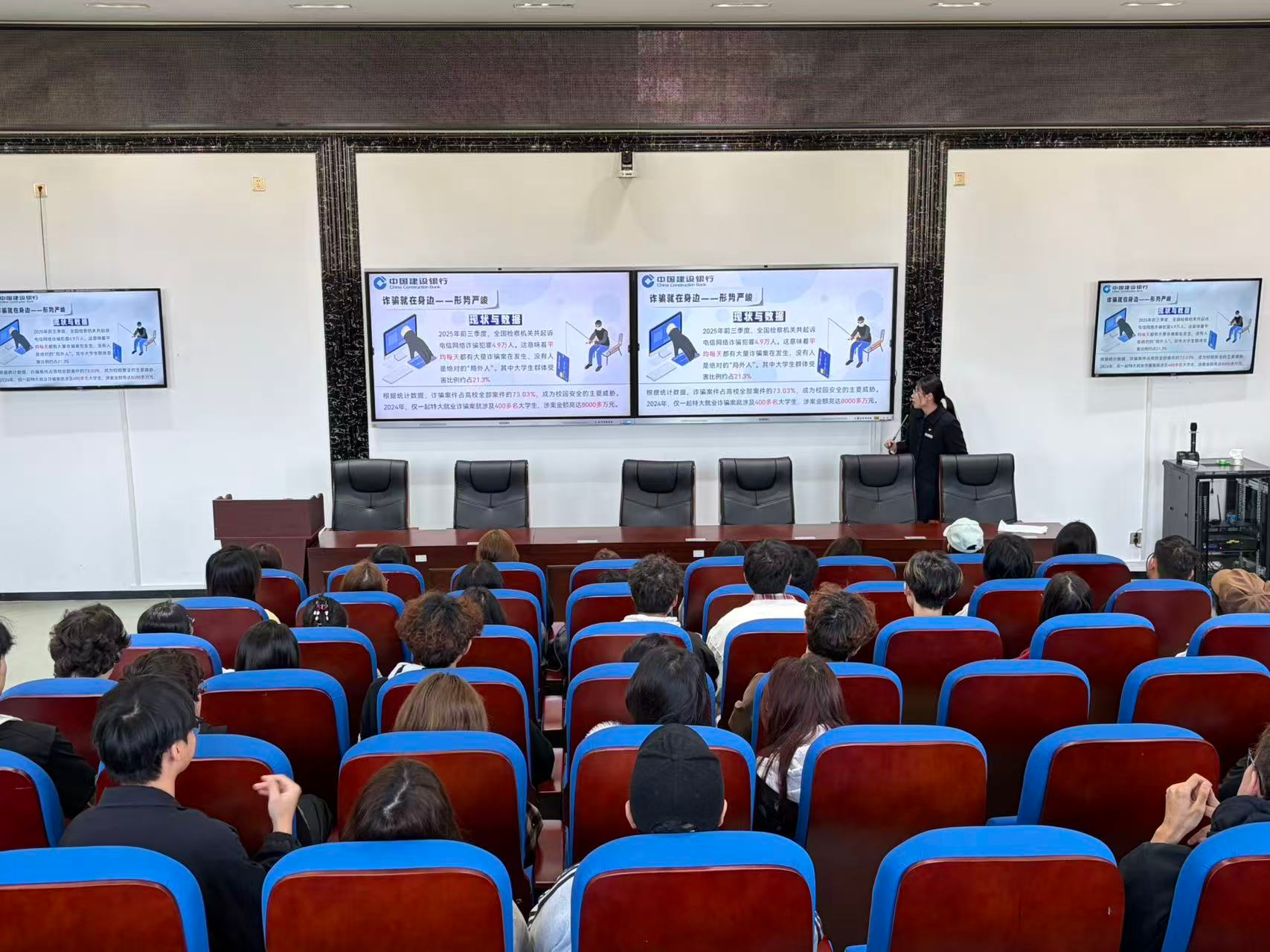 活动紧扣铸牢中华民族共同体意识主线,依托“一站式”学生社区贴近学生、服务学生的平台优势,精准聚焦少数民族学生金融安全需求,将安全教育与民族团结教育有机融合。建行金融从业者结合校园高发诈骗案例,细致讲解电信网络诈骗、非法“校园贷”、网络支付风险等常见金融陷阱,拆解诈骗套路与防范要点,普及银行卡使用、个人信息保护、理性消费等实用金融知识,现场解答学生疑问,发放防诈骗宣传资料,切实提升学生金融风险识别与自我防护能力。