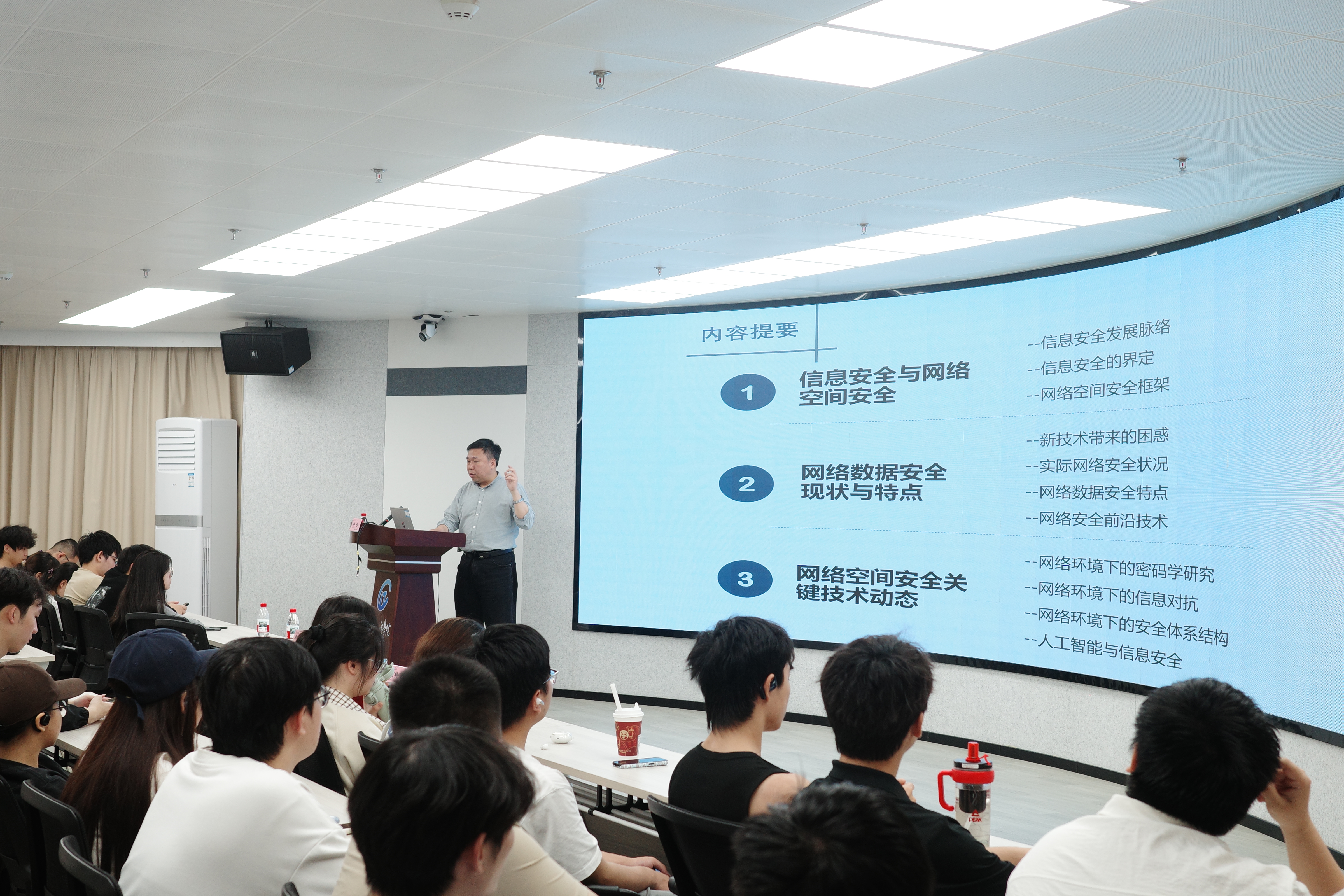 讲座中,许力教授围绕网络空间安全这一核心议题,从国家经济、社会、文化及军事等领域的战略需求出发,系统阐释了网络空间的定义、内涵与战略价值。他结合国内外网络空间安全发展态势与行业需求,深入剖析了技术变革趋势,并围绕当前网络安全面临的新风险与新挑战,从前沿案例、技术攻关、管理体系、协同机制等多维度进行了综合解读。许力教授还结合自身多年科研与教学实践,对网络空间安全专业的发展方向与就业前景进行了梳理,鼓励学生扎根专业学习、投身科研实践、主动追踪行业前沿动态。