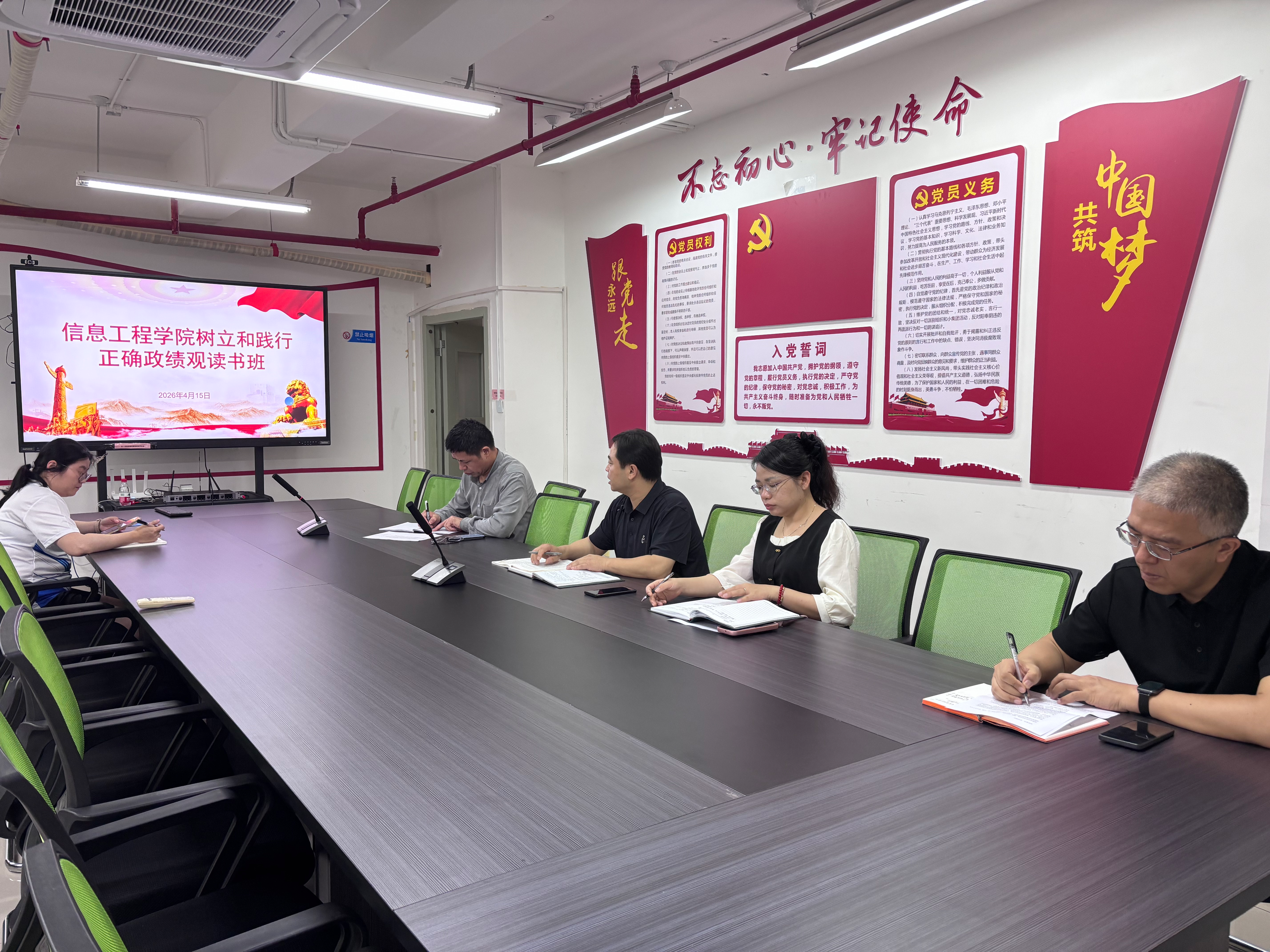 为全面贯彻习近平总书记关于树立和践行正确政绩观的重要论述,扎实推进学习教育走深走实,4月15日,信息工程学院举办树立和践行正确政绩观学习教育读书班(集中学习二)暨学习研讨活动。学院领导班子参加学习研讨,会议由学院党委书记李金波主持。