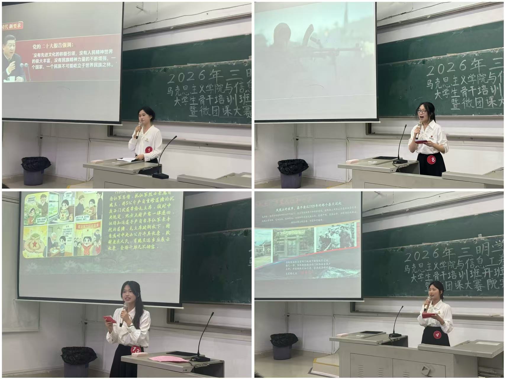 为强化青年思想政治引领,提升学生骨干综合素养,4月14日晚,信息工程学院、马克思主义学院于鸿文楼(一)201教室联合举办2026年大学生骨干培训班开班仪式暨主题微团课大赛院赛。两院团学干部、全体参训学员及参赛选手共同参加本次活动。