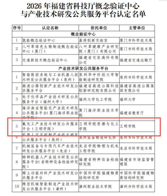 近日,福建省科学技术厅公布2026年概念验证中心与产业技术研发公共服务平台认定名单,我校申报的“氟化工产业技术研发公共服务平台”被认定为产业技术研发公共服务平台,这是我校首次获批省级产业技术研发公共服务平台。