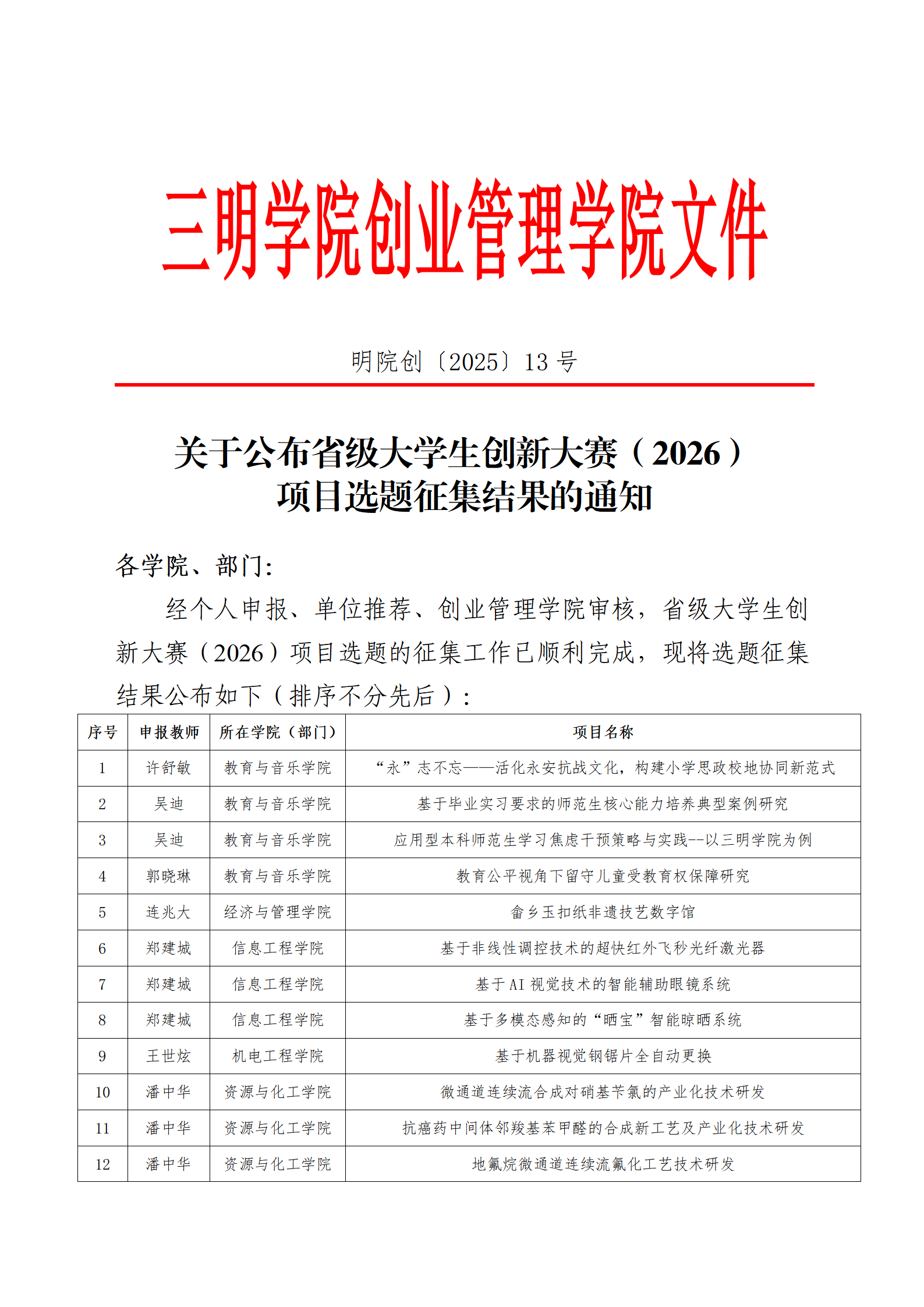 关于公布省级大学生创新大赛(2026)项目选题征集结果的通知