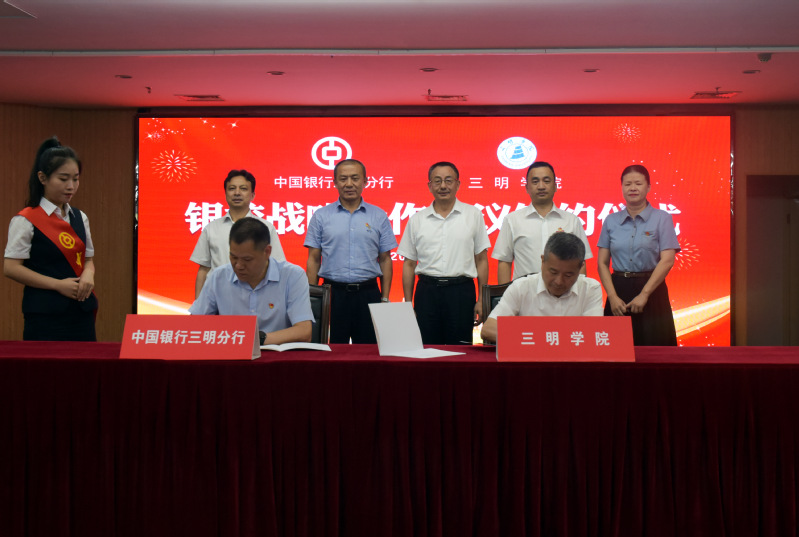 7月22日下午,三明学院与中国银行三明分行签订银校战略合作协议。中国银行三明分行陈志森行长、中国银行三明分行黄巧萍副行长,校领导赖锦隆、王乾廷、林建伟出席签约仪式。