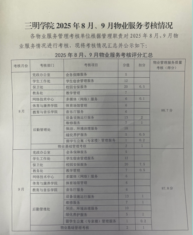 三明学院2025年8月、9月物业服务考核情况公示