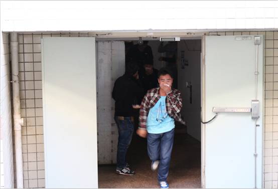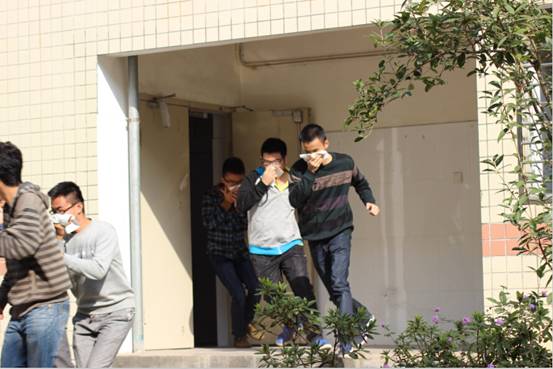 主持人宣布演练开始之后,随着模拟警报声在宿舍周围的响起,烟雾四散扩开,同学们纷纷用湿毛巾捂住口鼻并有序地从5号楼两个消防通道撤离危险区。两分钟后,全体参与演练的同学均已撤离至安全区域。保卫处吴仁荣老师随后对学生们的此次表现给予肯定,并传达了些消防小常识,逃生时注意用湿毛巾捂住口鼻、等待救援时应尽量在阳台、窗口等易被发现的地方等等。最后,院党总支林光初书记此次演练进行了总结。