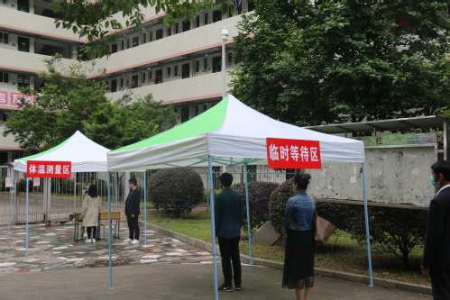 全体人员就位,在院党委书记魏茂金“演练开始”指令下演练正式开始。根据预案,“学生”戴口罩在临时等待区相互间隔1米排队,依次等待体温检测,值班辅导员在体温测量处根据“学生”体温做出引导,体温正常者刷卡进入宿舍楼大门入住宿舍。在出现体温异常、干咳、乏力、鼻塞、流涕、咽痛、腹泻等症状“同学”时,值班辅导员向楼栋长示意,由楼栋长带领“学生”前往隔离观察区登记、等待并对其做心理安抚,10分钟后进行再次体温检测依然超过37.3度时,楼栋长立即上报院党委副书记、校医院和相关部门。等待校医院人员带领至学校指定的隔离室进行后续流程。