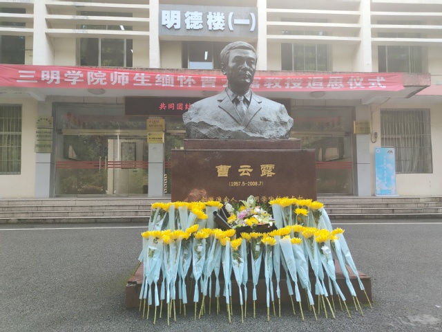 4月3日清晨,微风轻抚着细雨,叶间印射着微光,为大地轻柔地披上一层朦胧的薄纱。在这宁静而庄重的氛围中,一场缅怀追思仪式在三明学院明德楼前静静展开。曹云露教授的雕像静静地伫立在那里,仿佛在聆听世间的敬意与怀念。