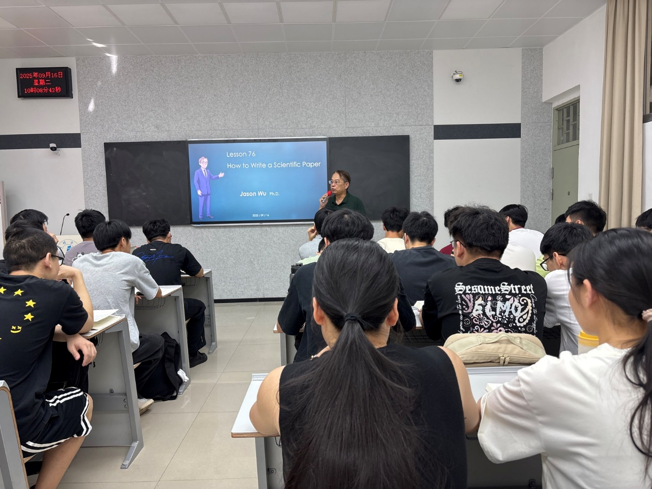 本次课程聚焦SCI学术论文的写作方法,吴国英老师结合自身科研与写作经验,从论文选题、摘要撰写、引言结构到图表呈现等方面进行了系统讲解。通过实例分析,帮助学生理解学术论文的逻辑框架与表达规范。课堂上,吴博士强调了国际学术交流中语言准确性与逻辑严谨性的必要性,指出SCI论文不仅是科研成果的展示,更是学术对话的重要桥梁。互动环节,学生积极提问,围绕论文写作中的常见难点展开讨论,现场气氛热烈。