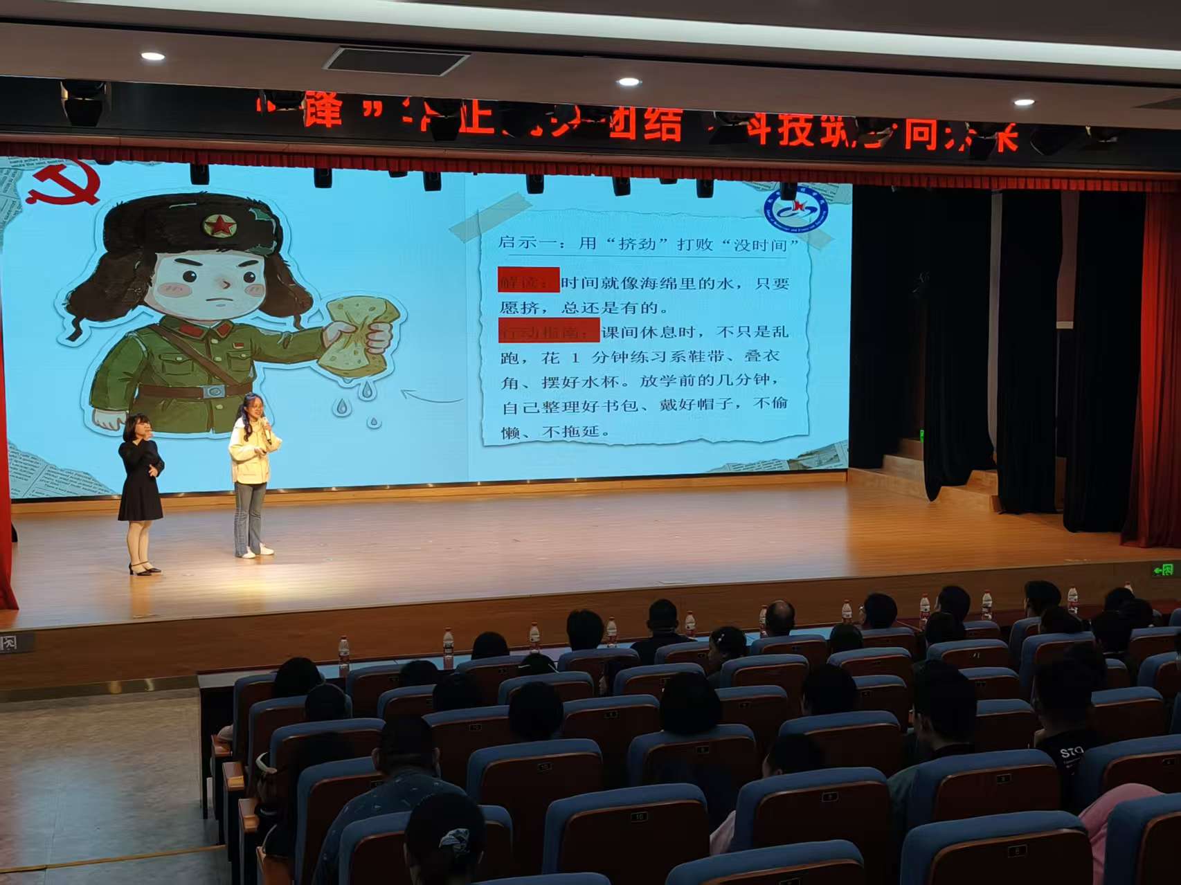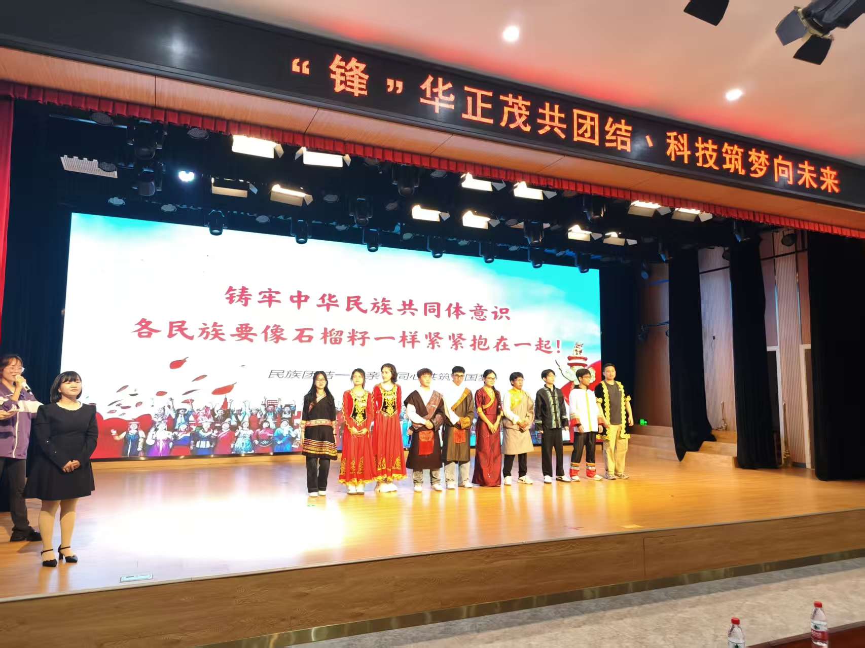 在特校大礼堂,活动在以手语“唱响”国歌中拉开帷幕。在特校老师的手语翻译配合下,学生党员代表带来一堂生动的多样微团课。在雷锋精神篇,学生以雷锋助人为乐的故事为引,结合机电专业志愿服务特色,阐释了新时代“螺丝钉”精神的深刻内涵。民族团结篇则通过观看短视频、有奖竞猜民族图片、少数民族志愿者上台表演等方式,生动地介绍了各民族特色。在欢快的课程尾声,参与活动的领导、老师为特校的同学们送上爱心礼包。